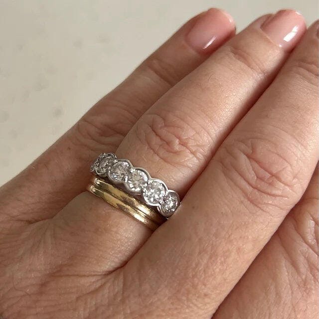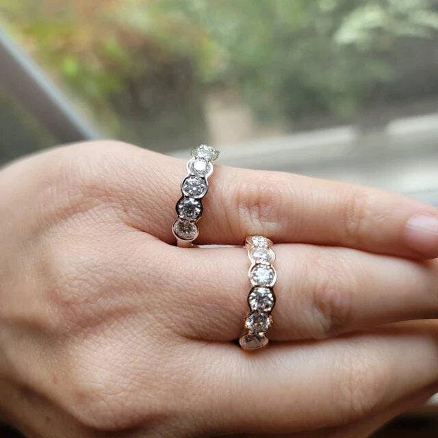 Versatile Style: The bezel setting enhances the beauty of stones, from classic round cut wedding band designs to modern half eternity bands with multiple stones. It's a versatile style that works with any outfit, making it ideal for daily wear.