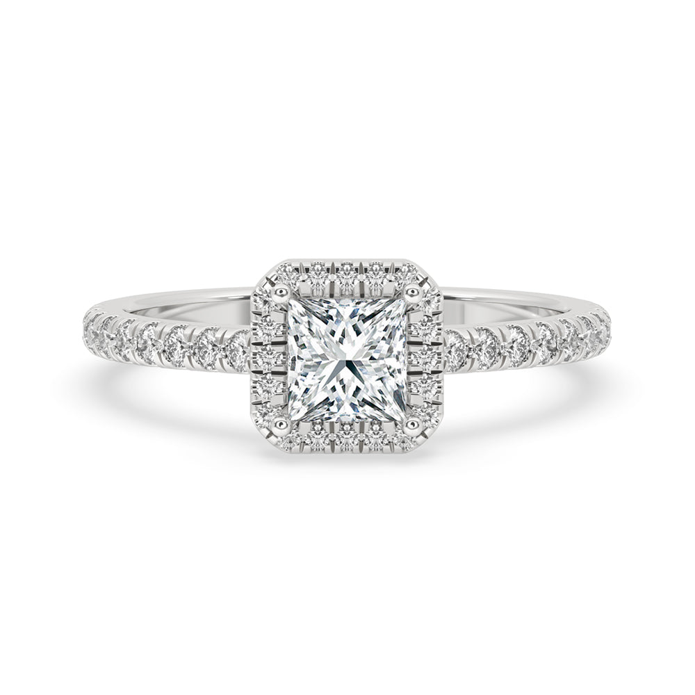 Celebrate your love with the classic, sophisticated commitment symbol the princess cut halo ring. The princess halo cut and halo setting guarantees constant brilliance of this ring.