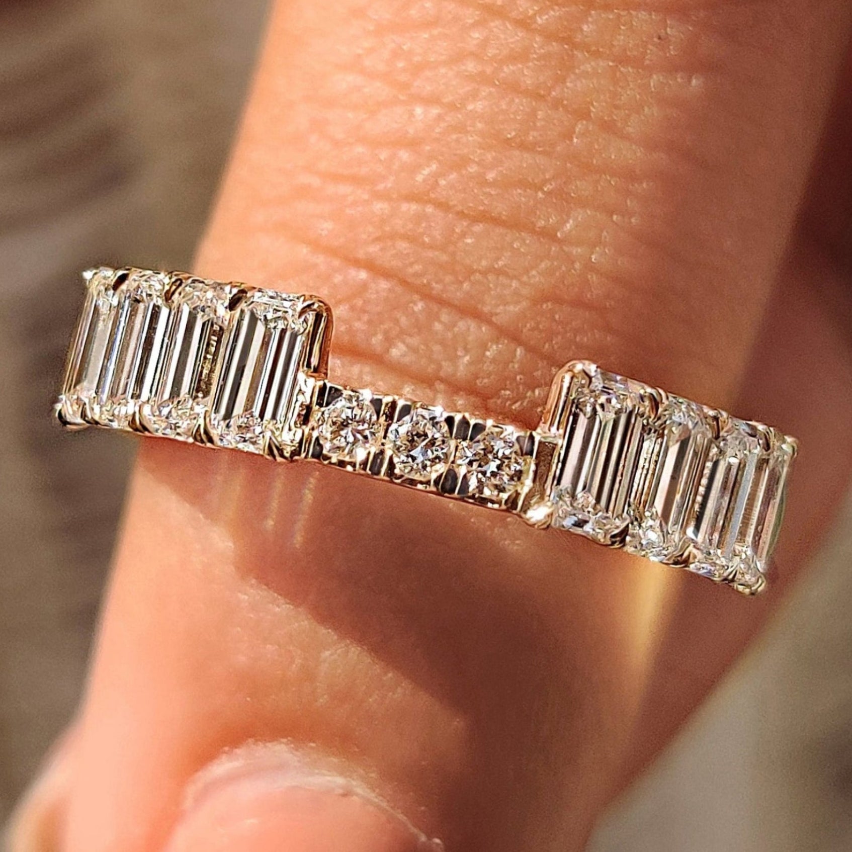 These Emerald Cut Diamond Wedding Bands look like a row of tiny skylights. The long, flat shapes give a calm, steady glow that feels very high end. Pick a band that has a solid weight and a crisp, glassy look for your hand.