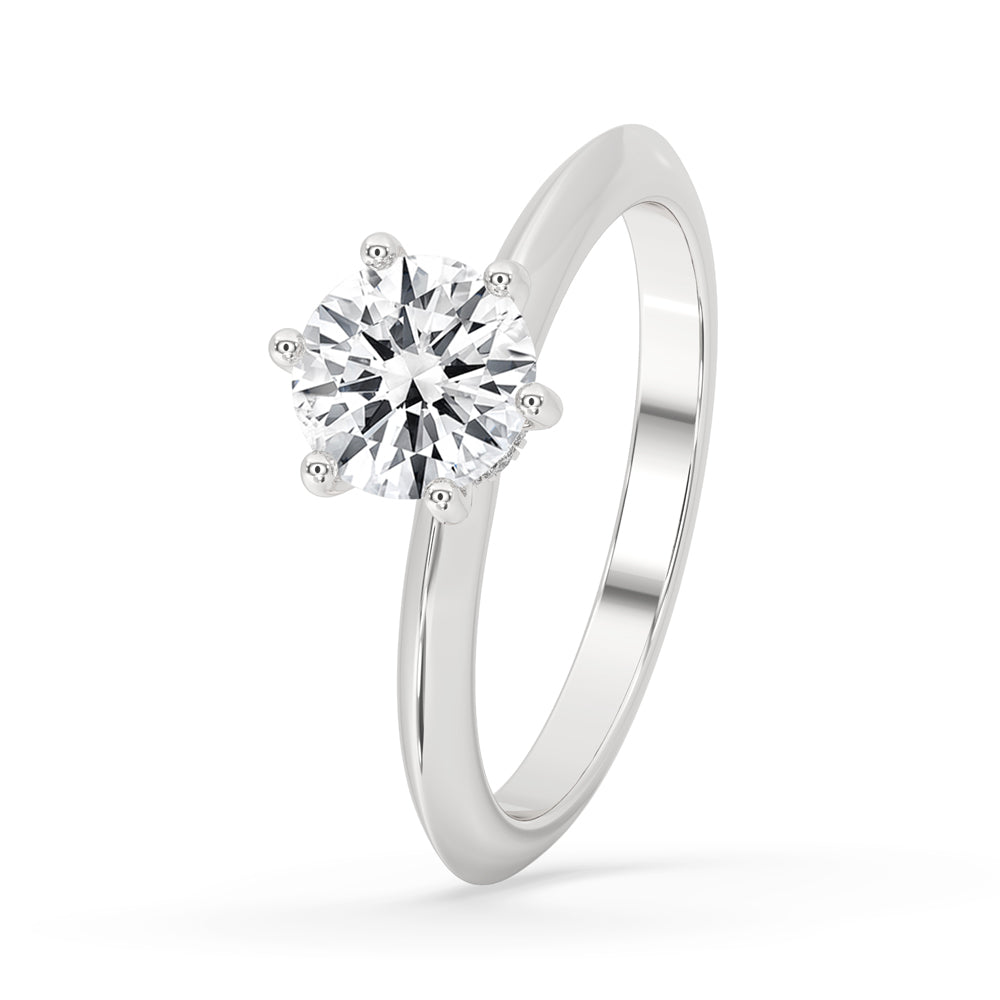 Perfect for any engagement, the Six Prong Engagement Ring offers classic elegance together with a safe, robust environment. Showcasing a magnificent round brilliant cut diamond, this ring has great beauty and shine. The diamond is tightly held by the 6 prong ring, therefore improving its brilliance and offering long-lasting durability. This ring provides excellent workmanship and sustainability whether your preferred Lab Grown Diamond or genuine stone.