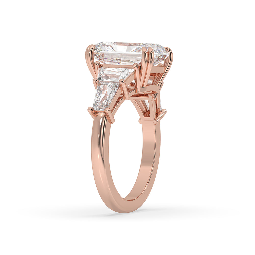 The 5 Stone Diamond Ring in rose gold is a timeless symbol of love and commitment. With its radiant cut diamonds and trapezoid side stones, this engagement ring offers a stunning display of brilliance and beauty. Whether you are looking to buy an engagement ring or customize a unique piece, this exquisite ring combines high quality craftsmanship with modern design elements.