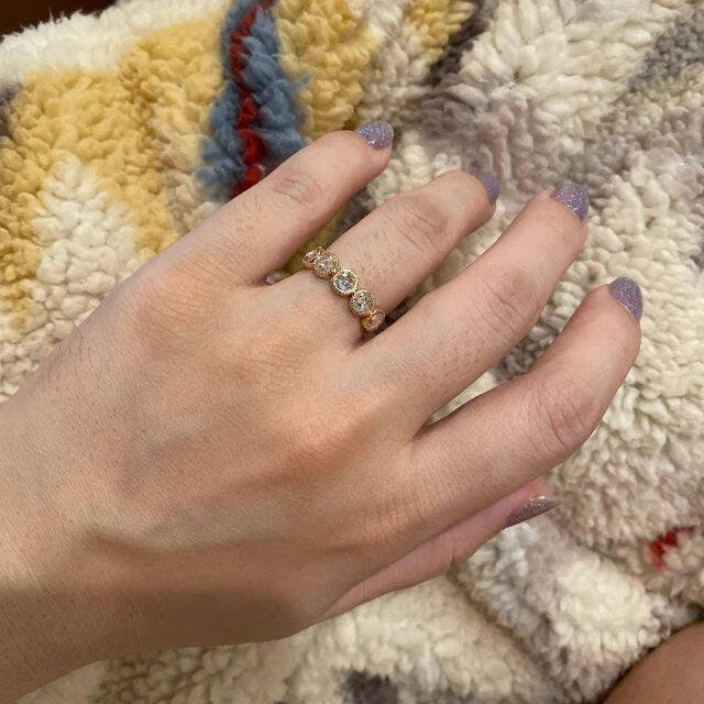 At Carat Diamonds, this round rose cut Moissanite band is made for those who want detail without extra flash. The milgrain bezel set band uses small edges to frame each stone, adding texture without making the ring bulky. The full structure offers strength for daily wear.