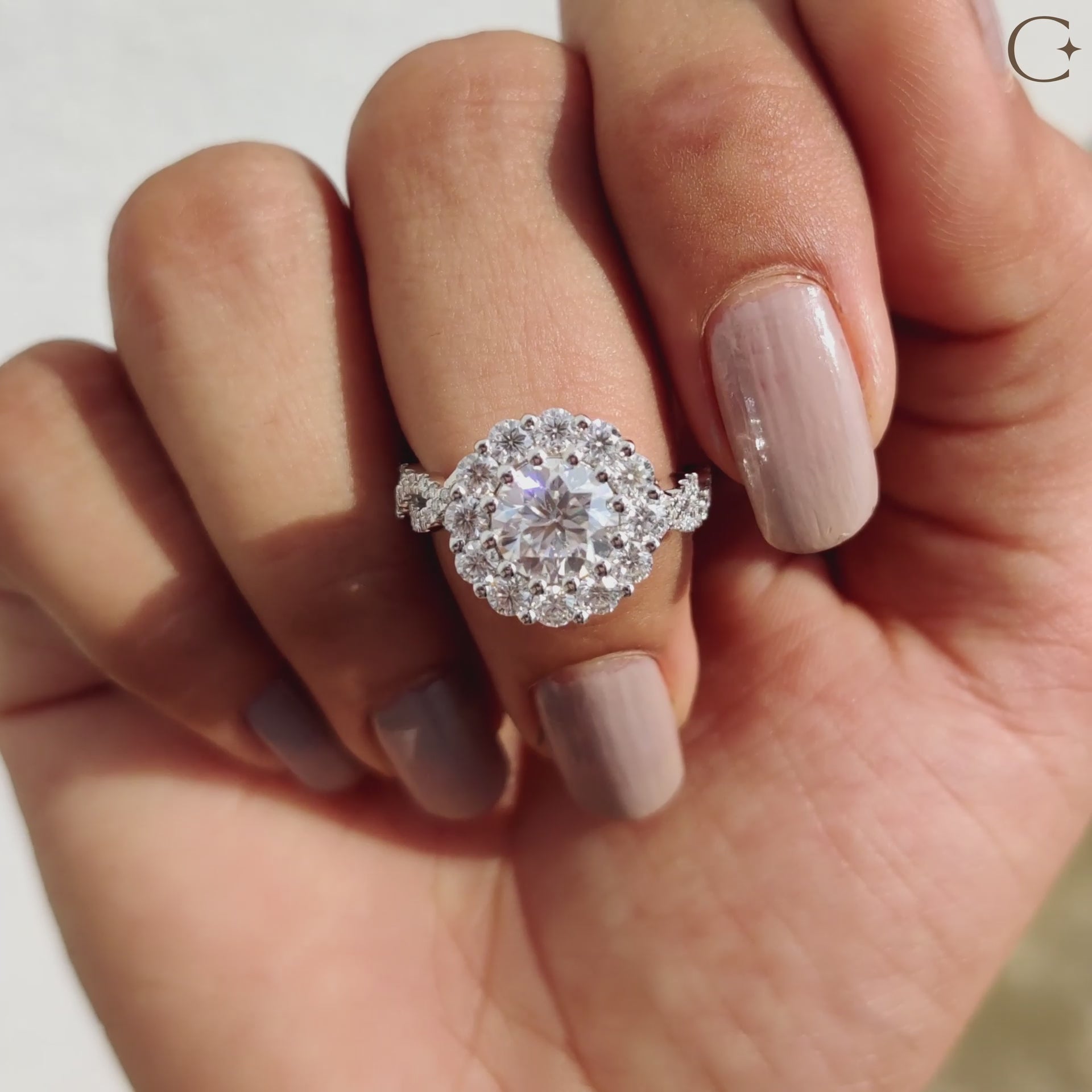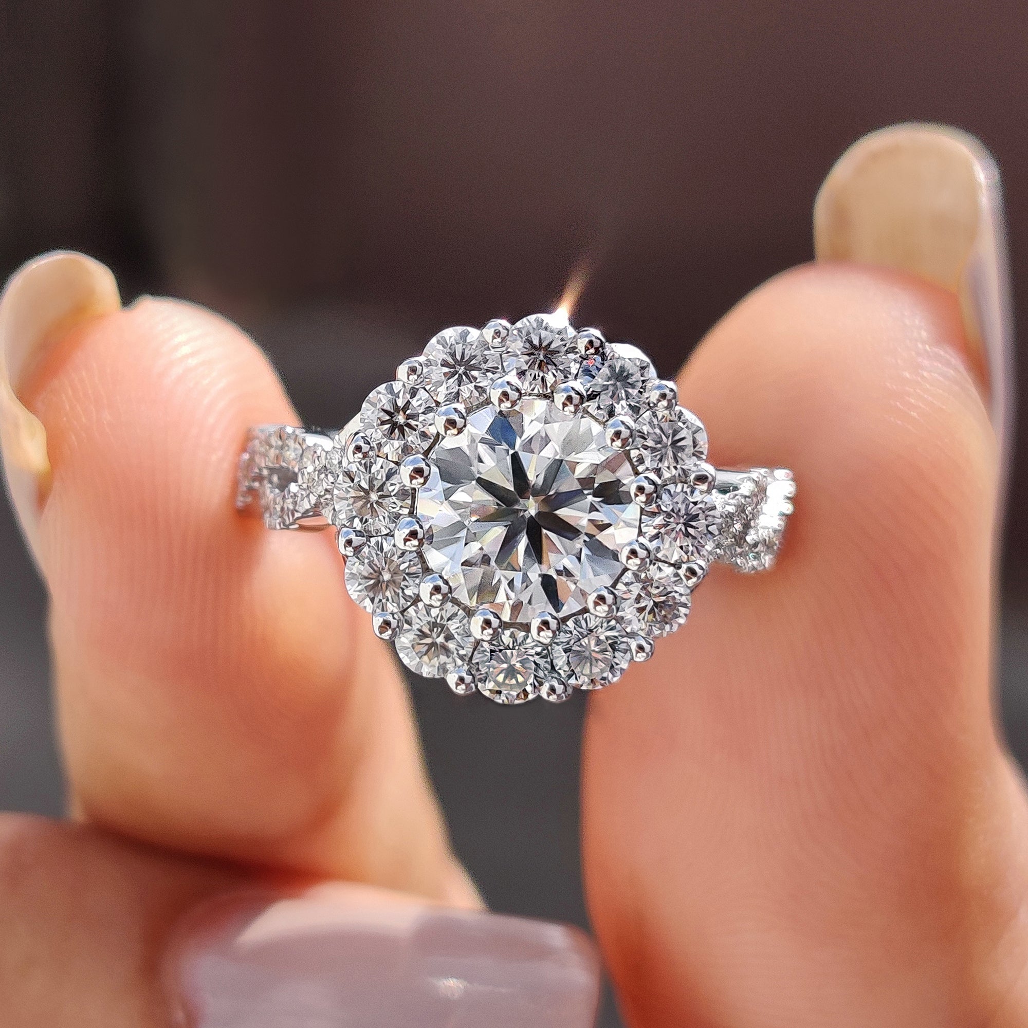 The pave twist band accentuates the stone's natural brilliance so it may sparkle from all sides. Accessible in white gold engagement ring settings, this ring presents a simple yet elegant finish. Whether you choose a Moissanite ring, the halo round cut ring setting guarantees your stone is brilliantly shown and securely kept.