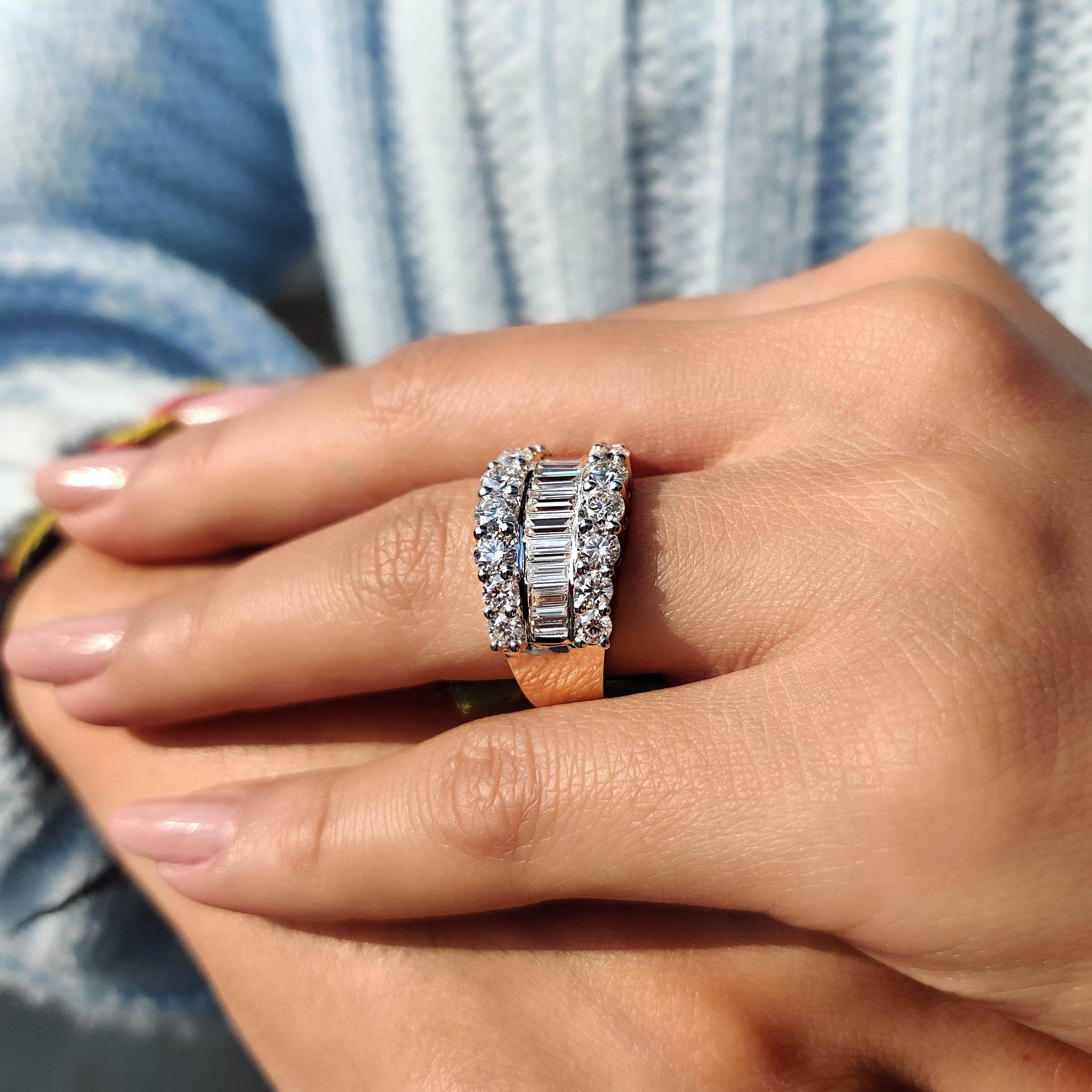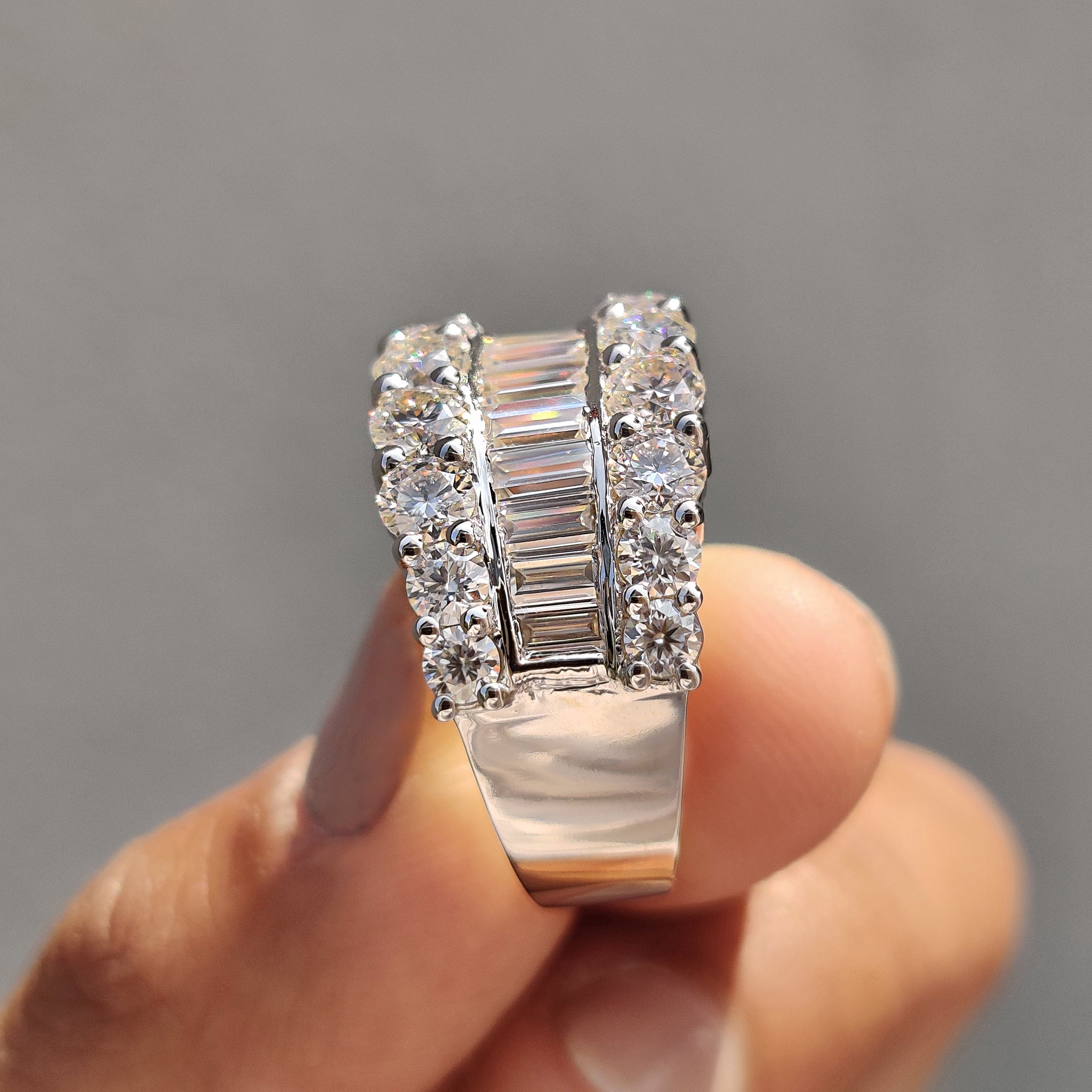 Baguette and Round Wedding Band offer a striking balance of shape and structure. Crafted with clean lines and strong detail, this ring blends baguette stones and round stones in a seamless layout.