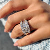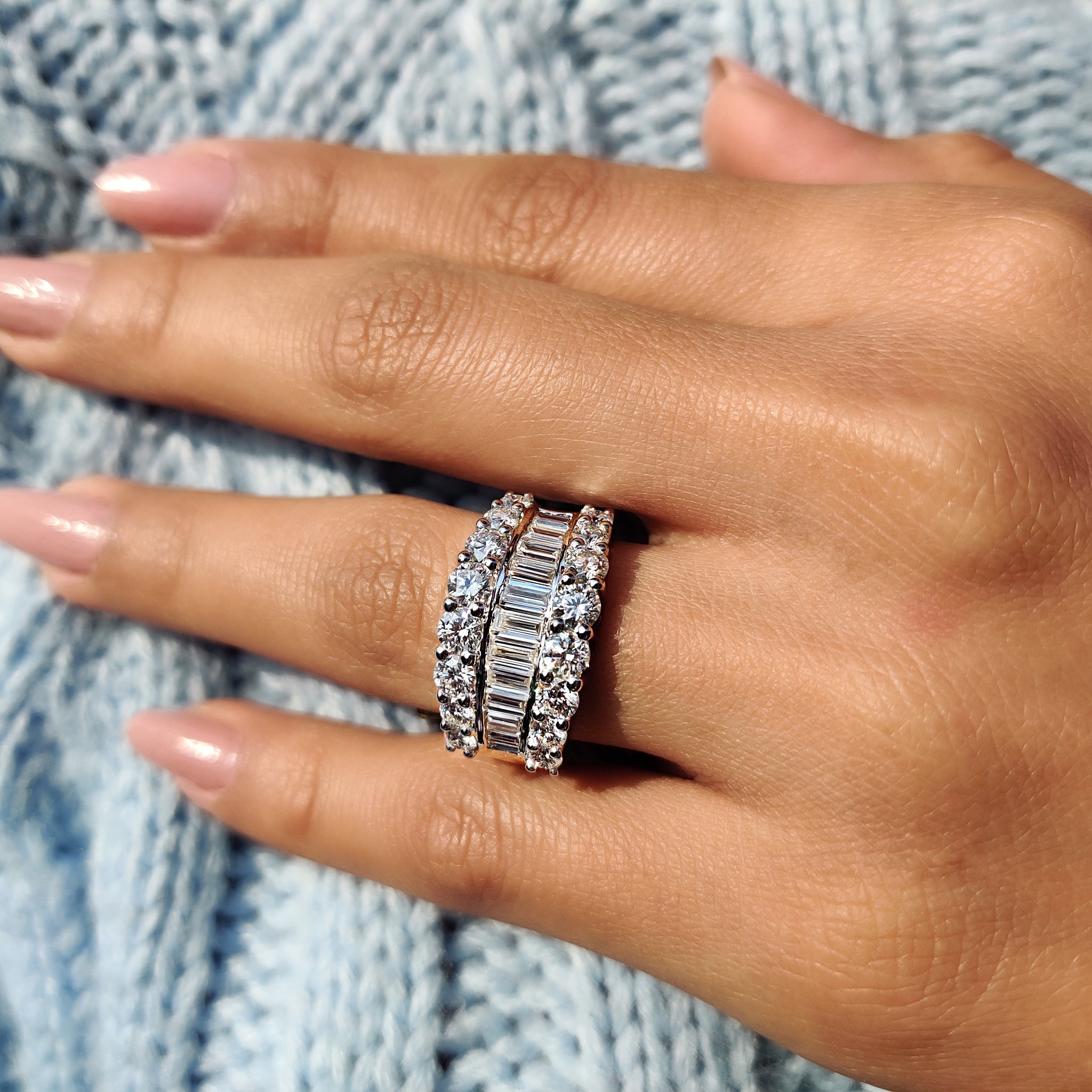 - Combines shapes in a unique three row pave band layout
