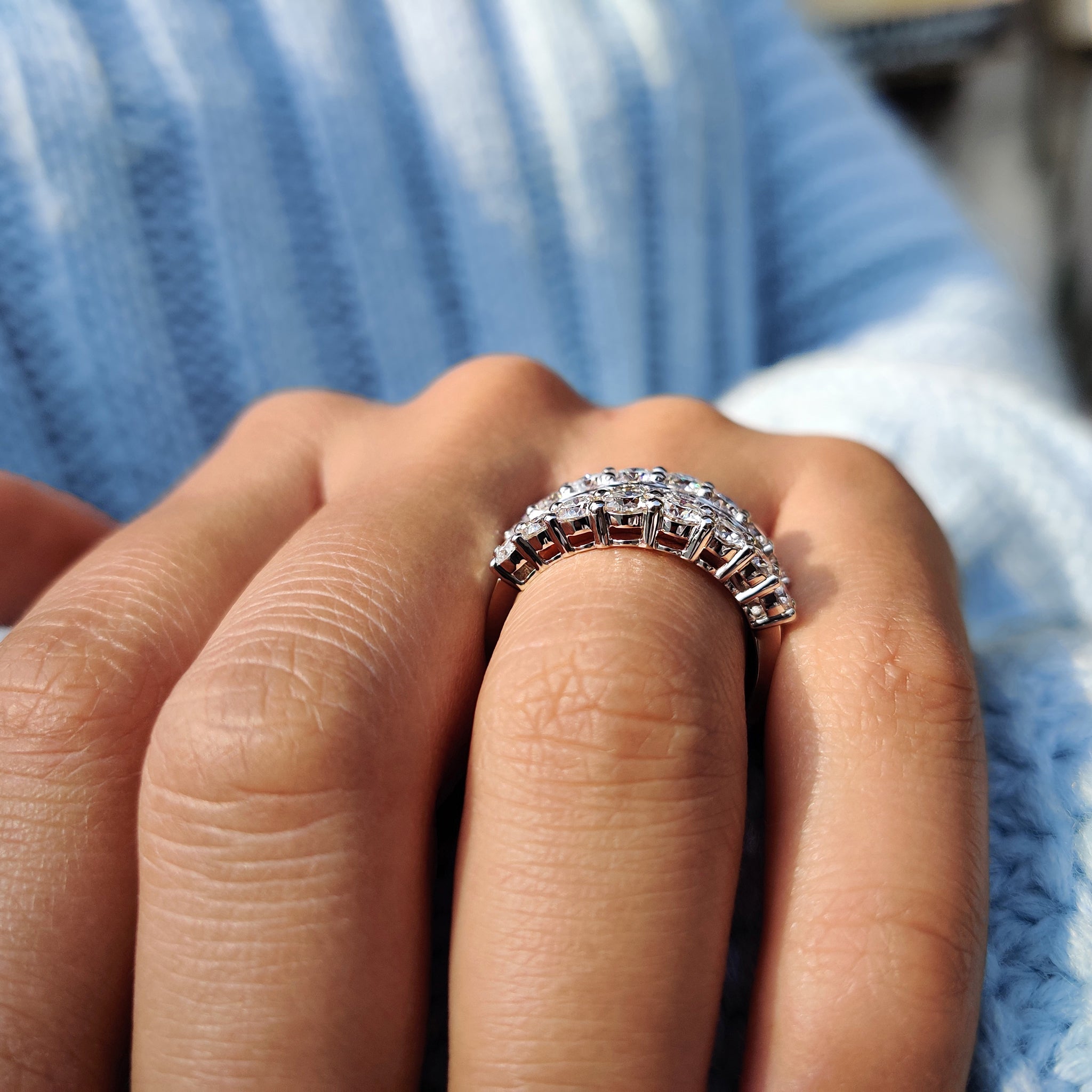- Features three row pave band design for layered texture