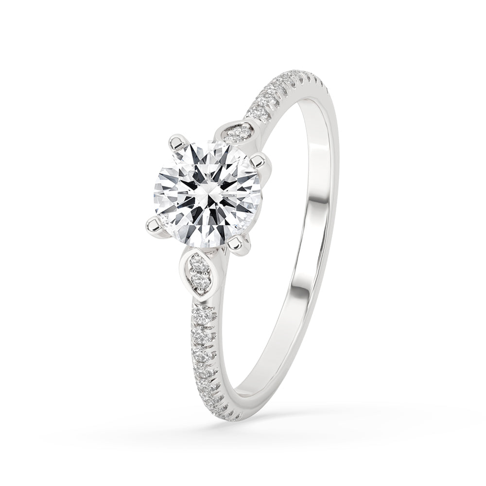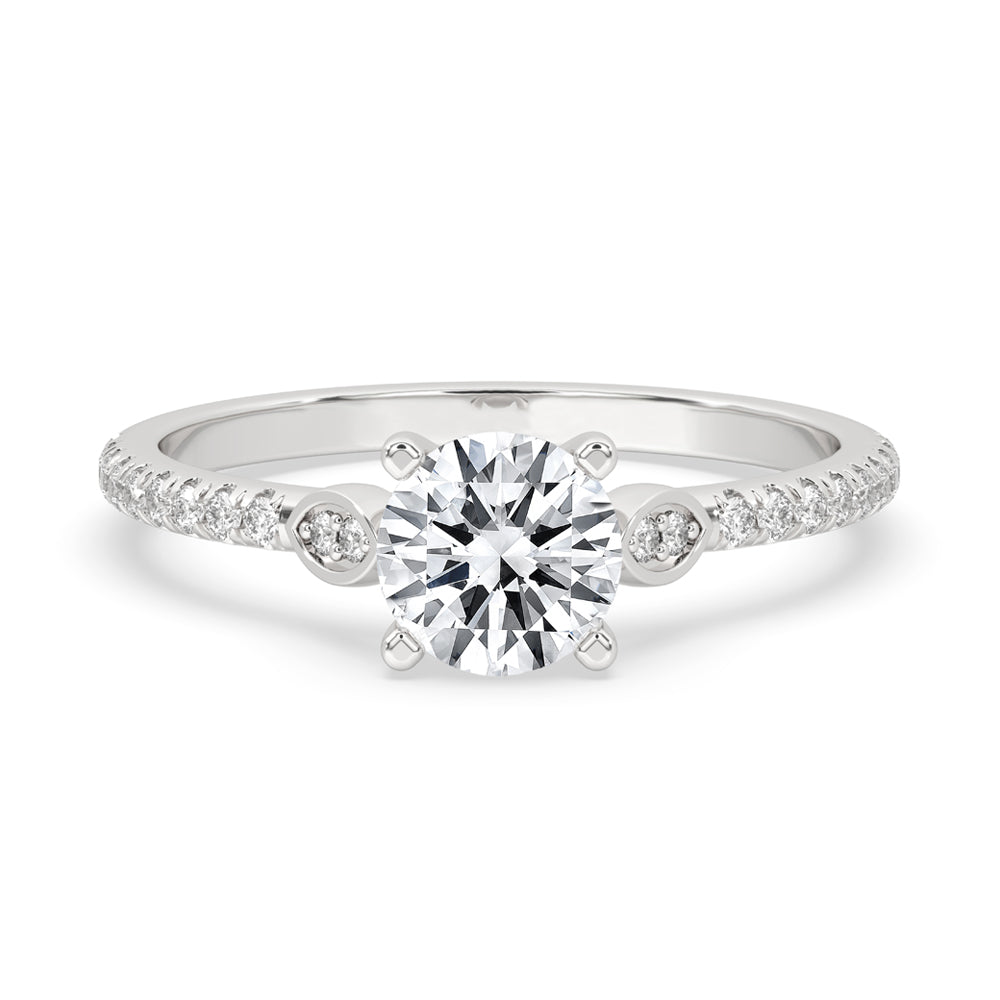 - Round diamond with side stones enhances the brilliance and adds elegance to the design.
