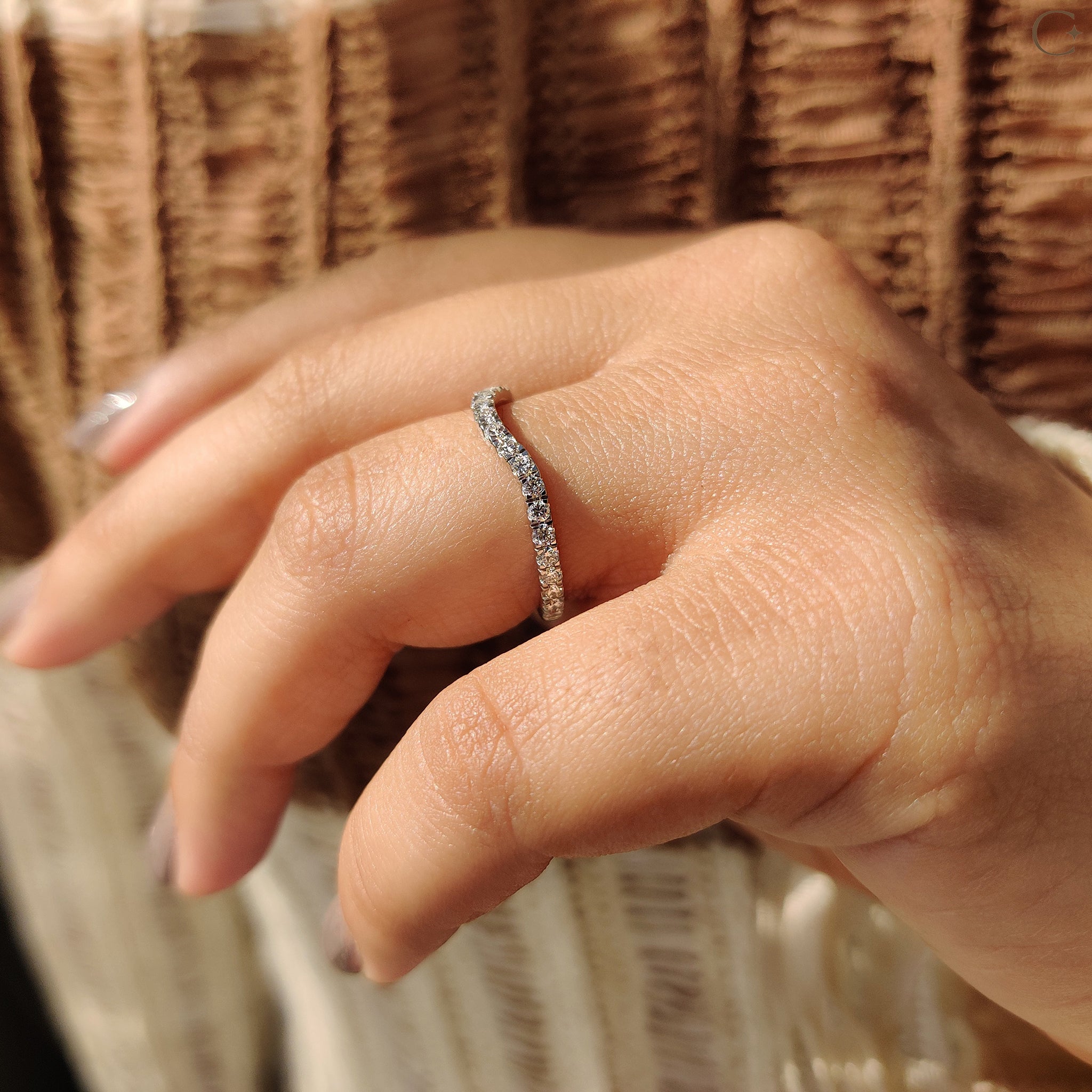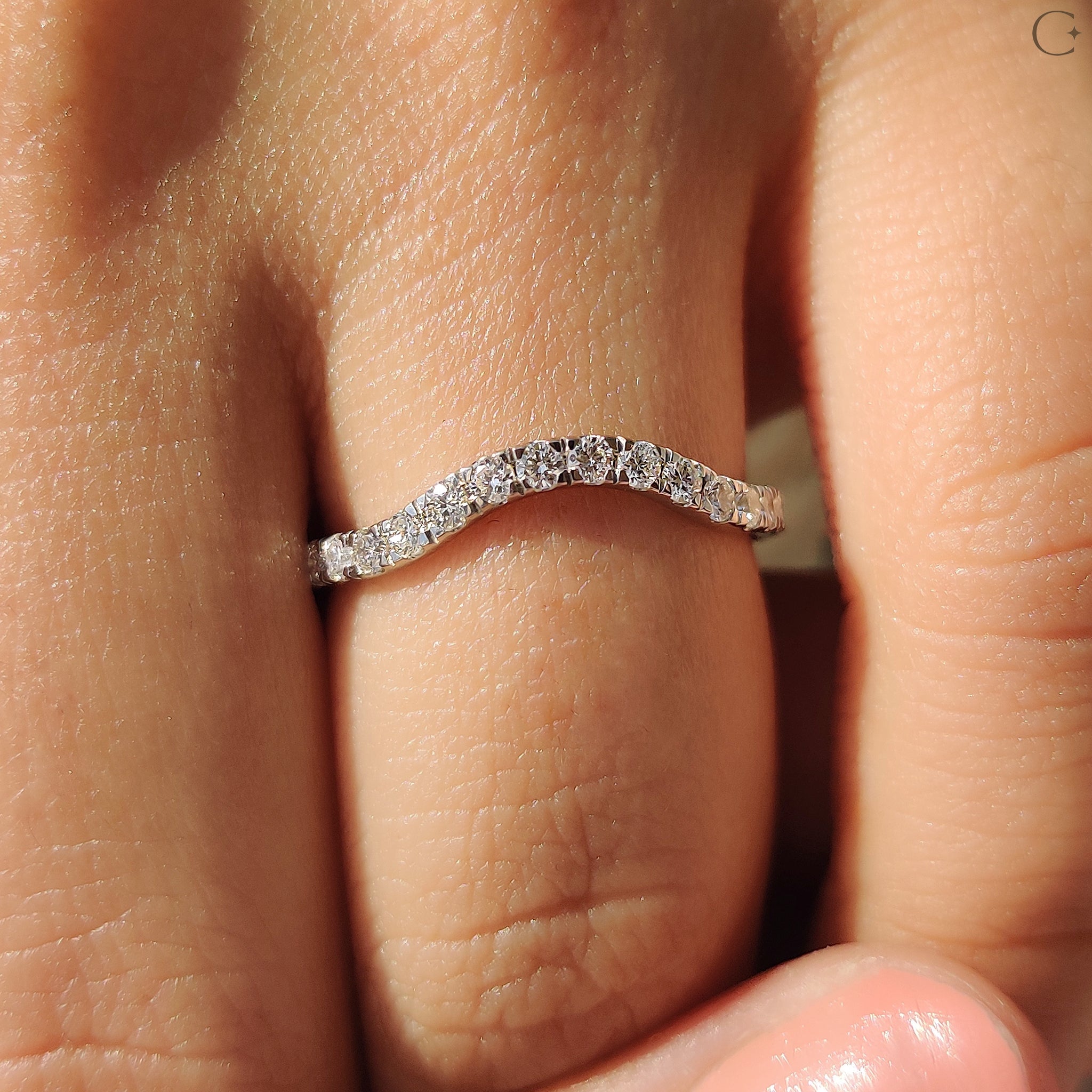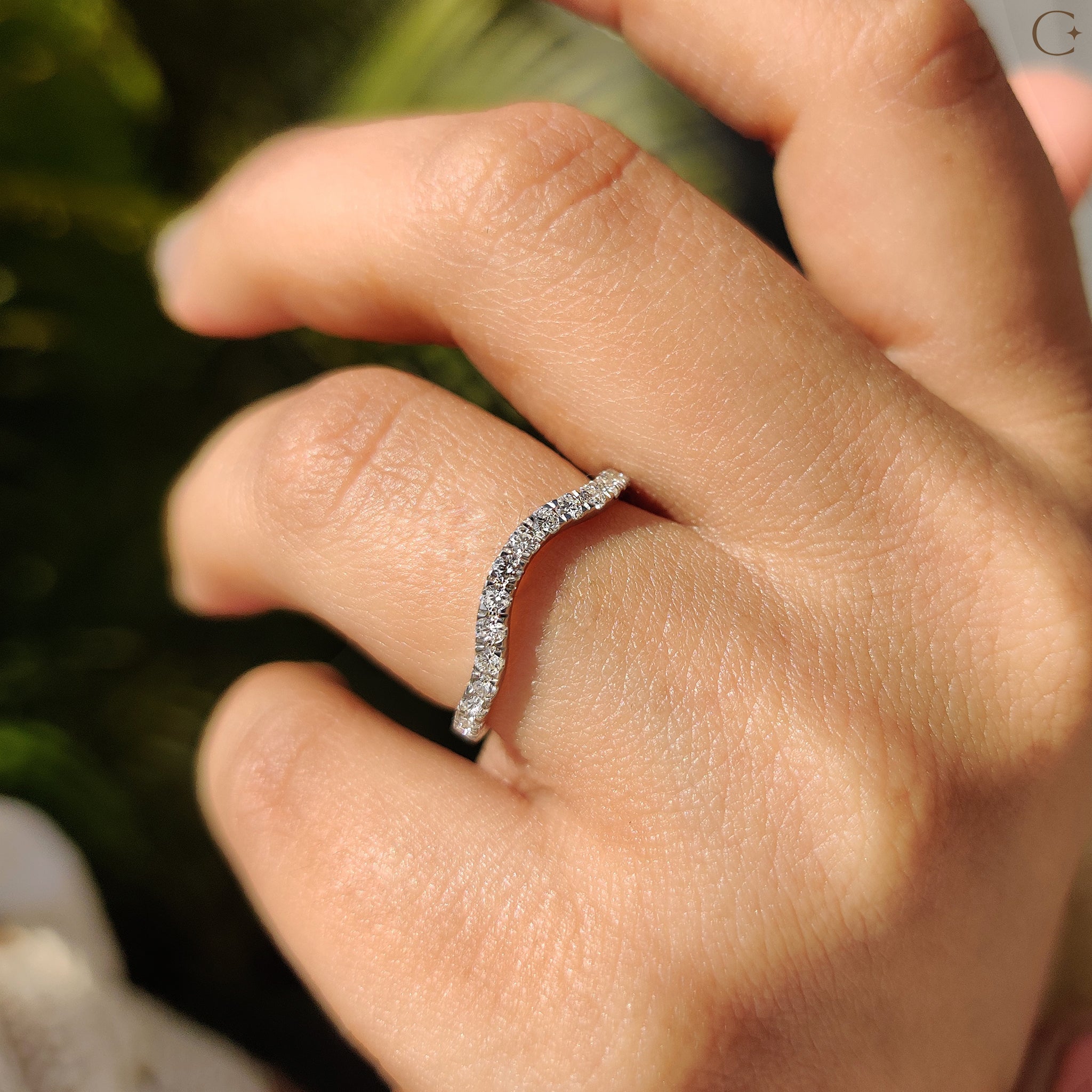 Comforts meet refinement in the curved gold wedding band. Perfect for stacking or single use, special for its beautiful curve, superb workmanship, and IGI-certified shine. Celebrate your story with a band that speaks volumes subtle, unique, and very meaningful.