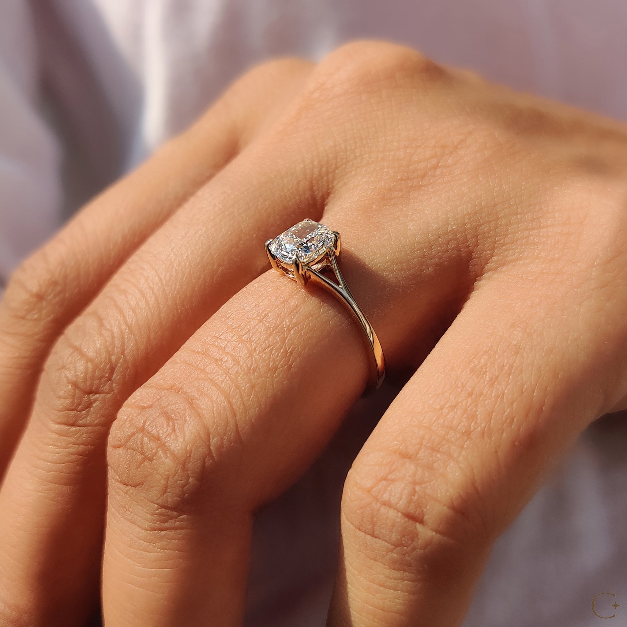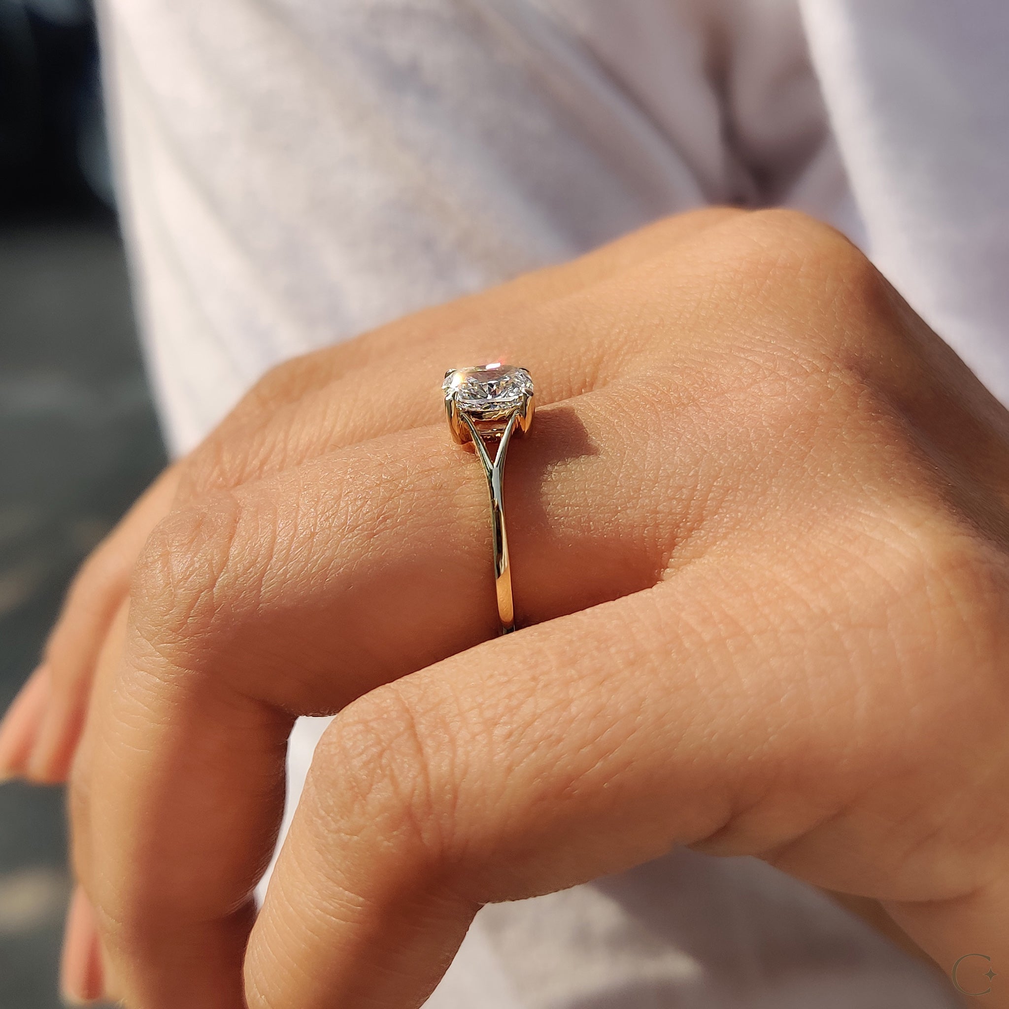 Perfect for a modern yet classic look, this cushion diamond ring boasts magnificent cushion cut diamond set in a split shank design. Moreover, the precisely carved ring features a claw prong setting that accentuates the brightness of the diamond. Designed in yellow gold, this handcrafted engagement ring comes IGI certified and has Lab Grown Diamond. For everyone looking for a magnificent, ethical, and moral work of art, this is perfect.