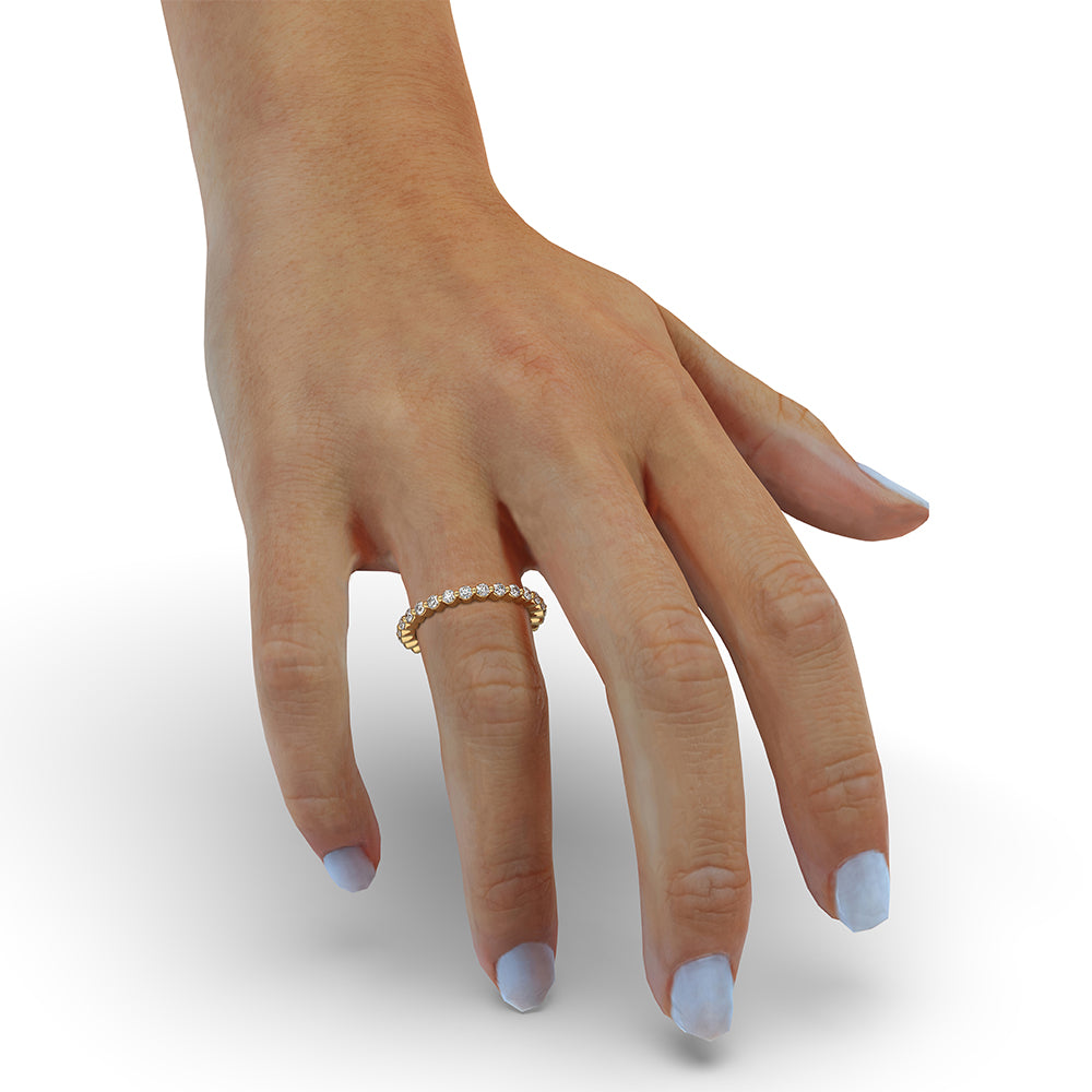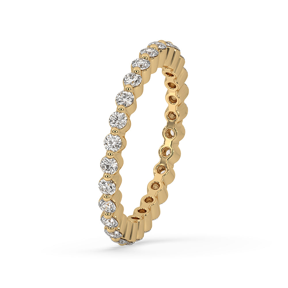 A sign of affection and dedication, the Gold Eternity Band This yellow gold eternity band, meant for enduring beauty, with a continuous circle of shining diamonds. Moreover, the shared prong eternity band setting guarantees a strong hold and increases brilliance. Whether worn alone or as part of a wedding band stack, this item gives any jewelry collection simple appeal.