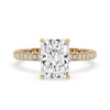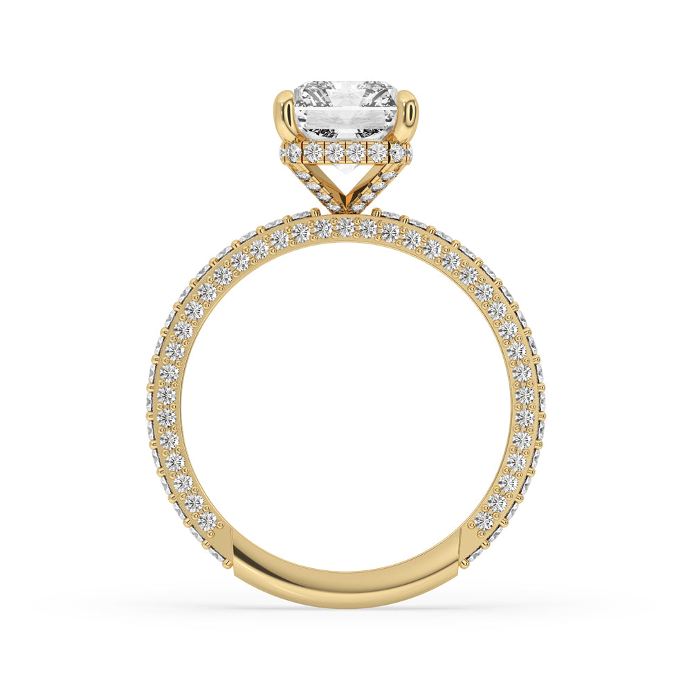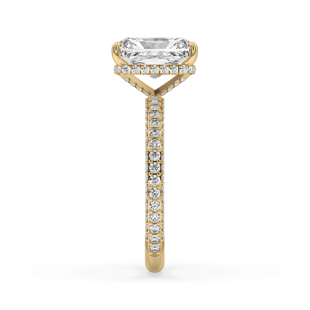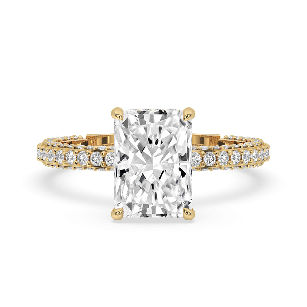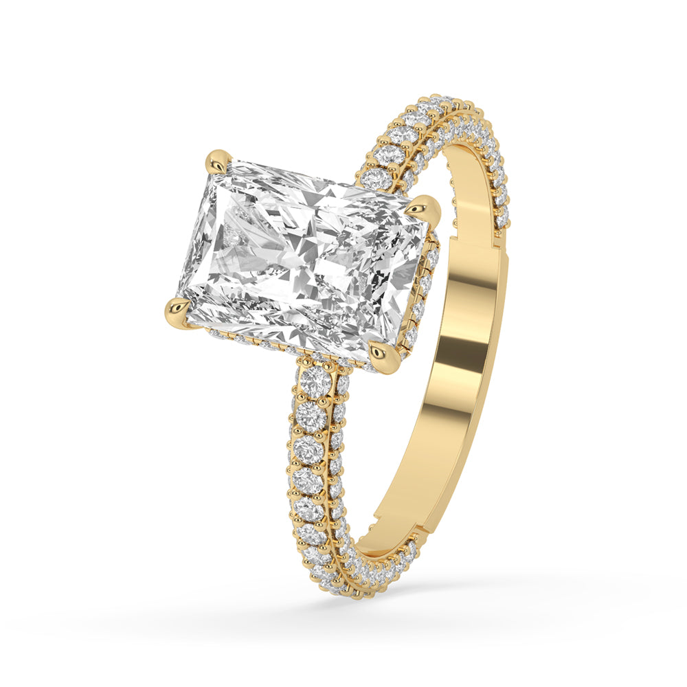 Selecting a Lab Grown Diamond or a natural diamond will help you to customize your hidden halo radiant engagement ring. Choose from white gold, yellow gold, or rose gold to personalize the metal for your gold pave ring. Furthermore decide on the appropriate pave band engagement ring style to fit your taste and the size of your 2 carat radiant cut diamond ring.