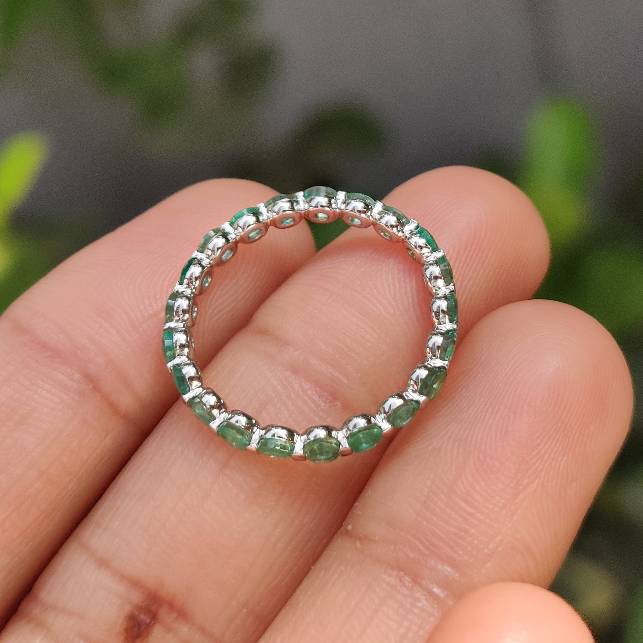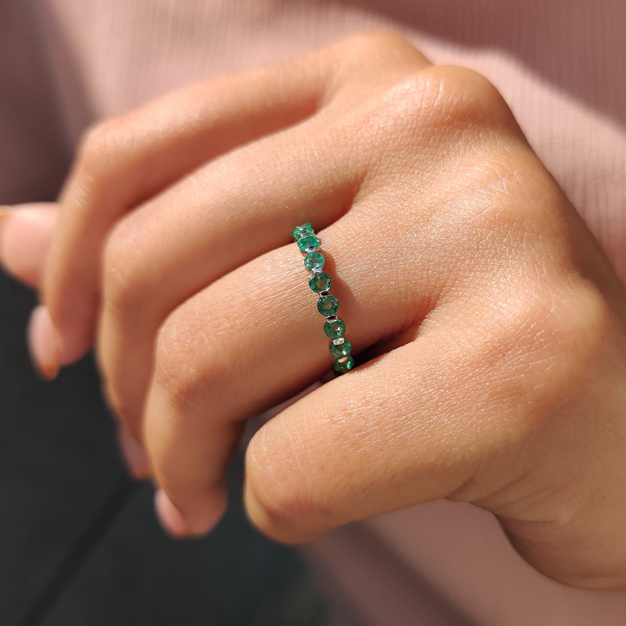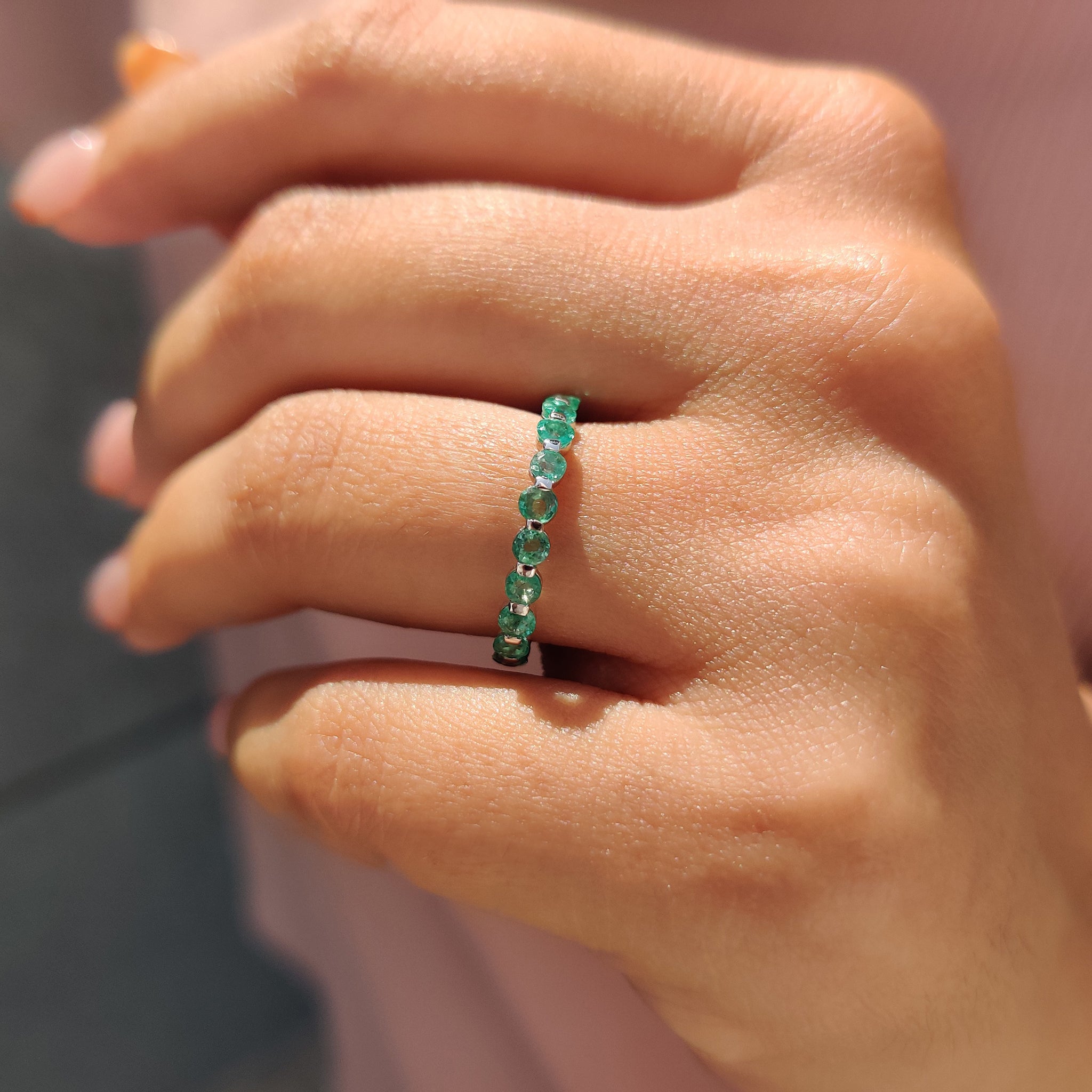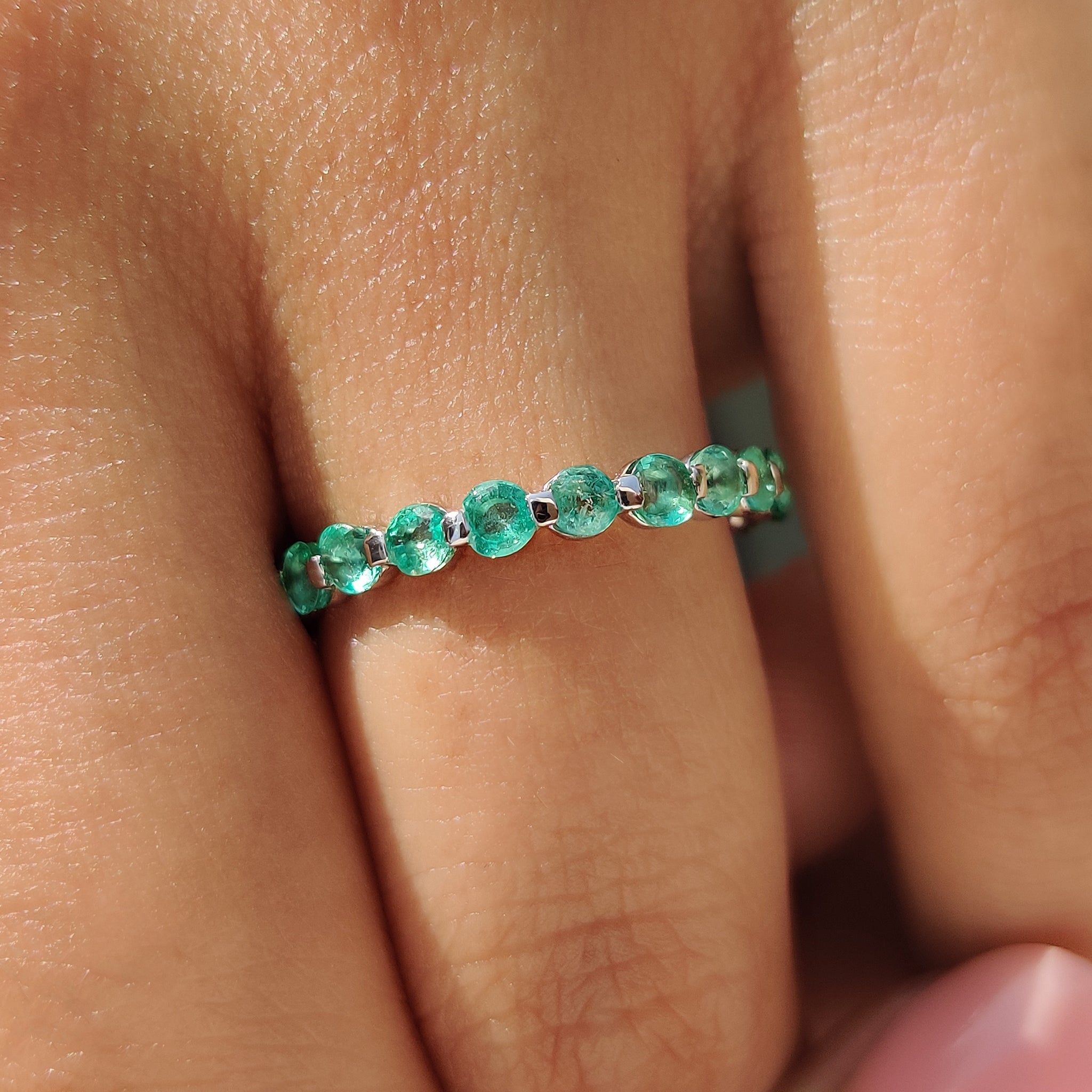 Each emerald wedding band fits comfortably while maintaining a clean and balanced shape. Whether you’re building a stackable wedding band look or adding it to a bridal set, it blends well. Emerald wedding band structure of the white gold wedding band adds strength and shine to the soft green tones.