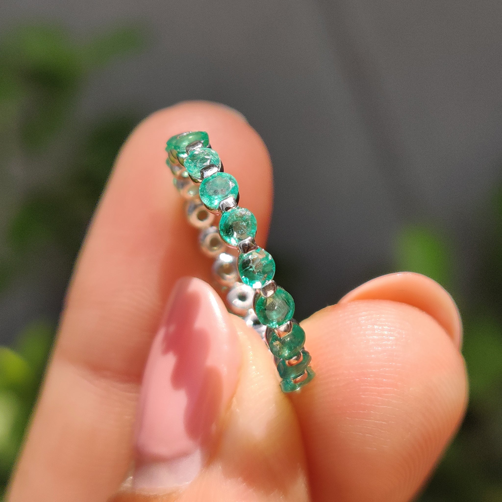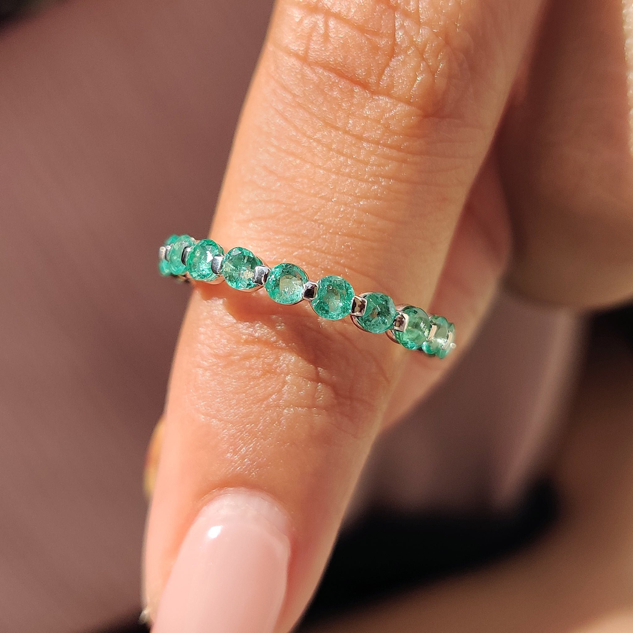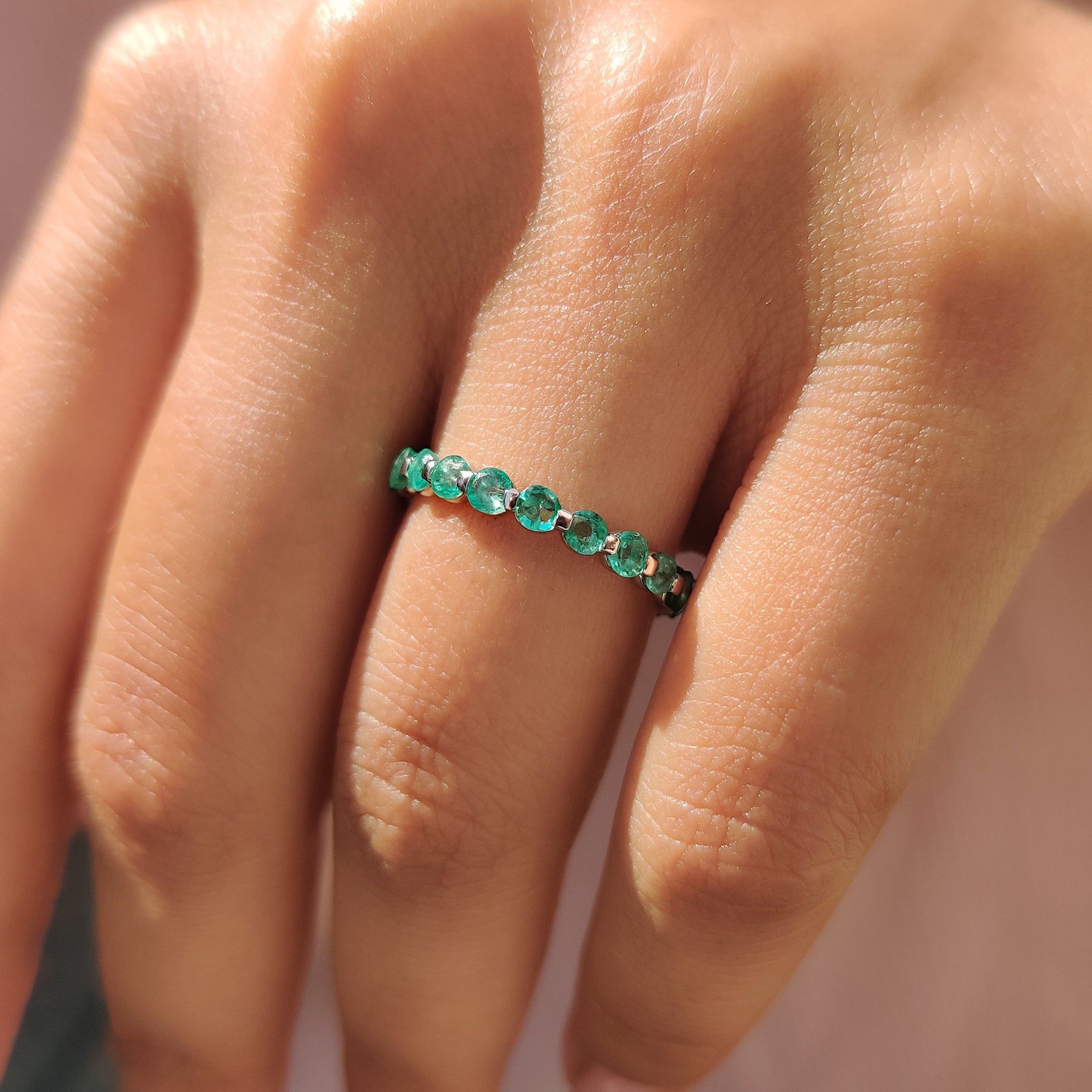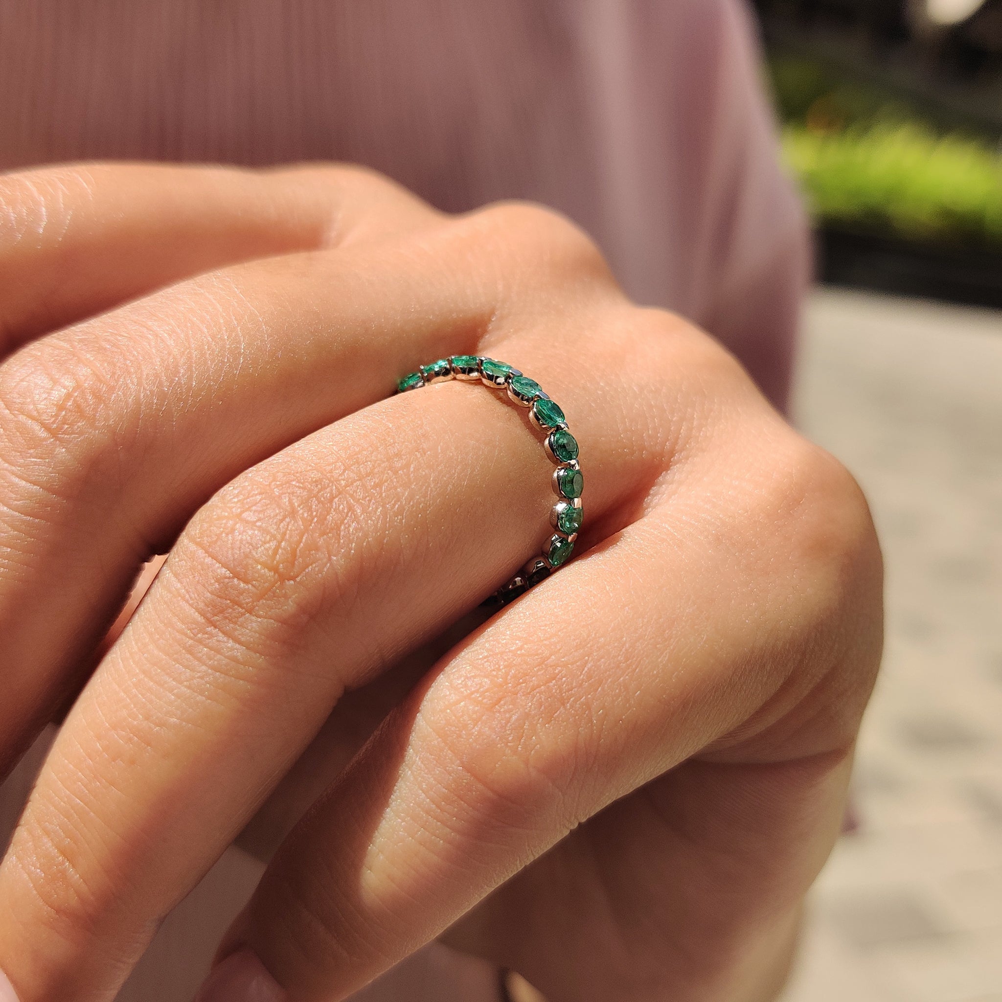 A beautiful gift for someone you love, the Emerald wedding band suits birthdays, anniversaries, or engagement celebrations. Its soft green hue and clear sparkle make it both personal and versatile. This style also works for those who enjoy a bold twist on the classic eternity wedding band.
