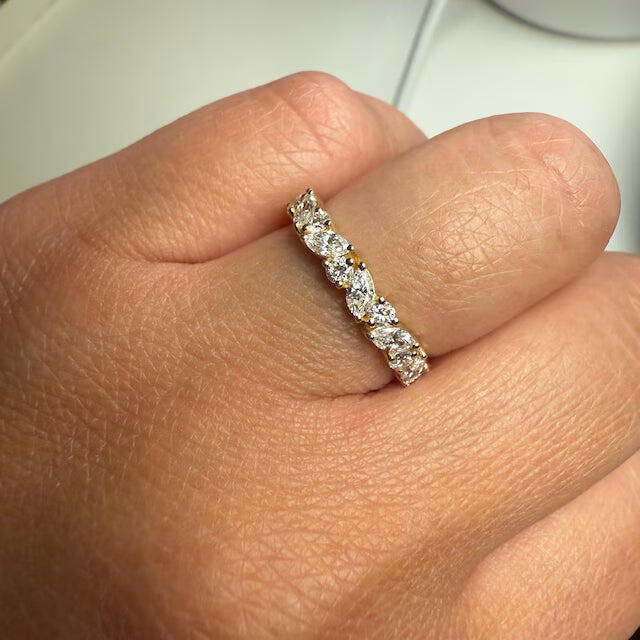 The Marquise And Round Wedding Band provides the ideal mix of modern elegance and traditional appeal. Designed with Lab Grown Diamonds, this ring features an amazing mix of round and marquise diamonds. Couples searching for a distinctive but classic wedding band can find great quality here. This design blends both for a spectacular impact whether your search is for a round diamond ring or a marquise diamond band.