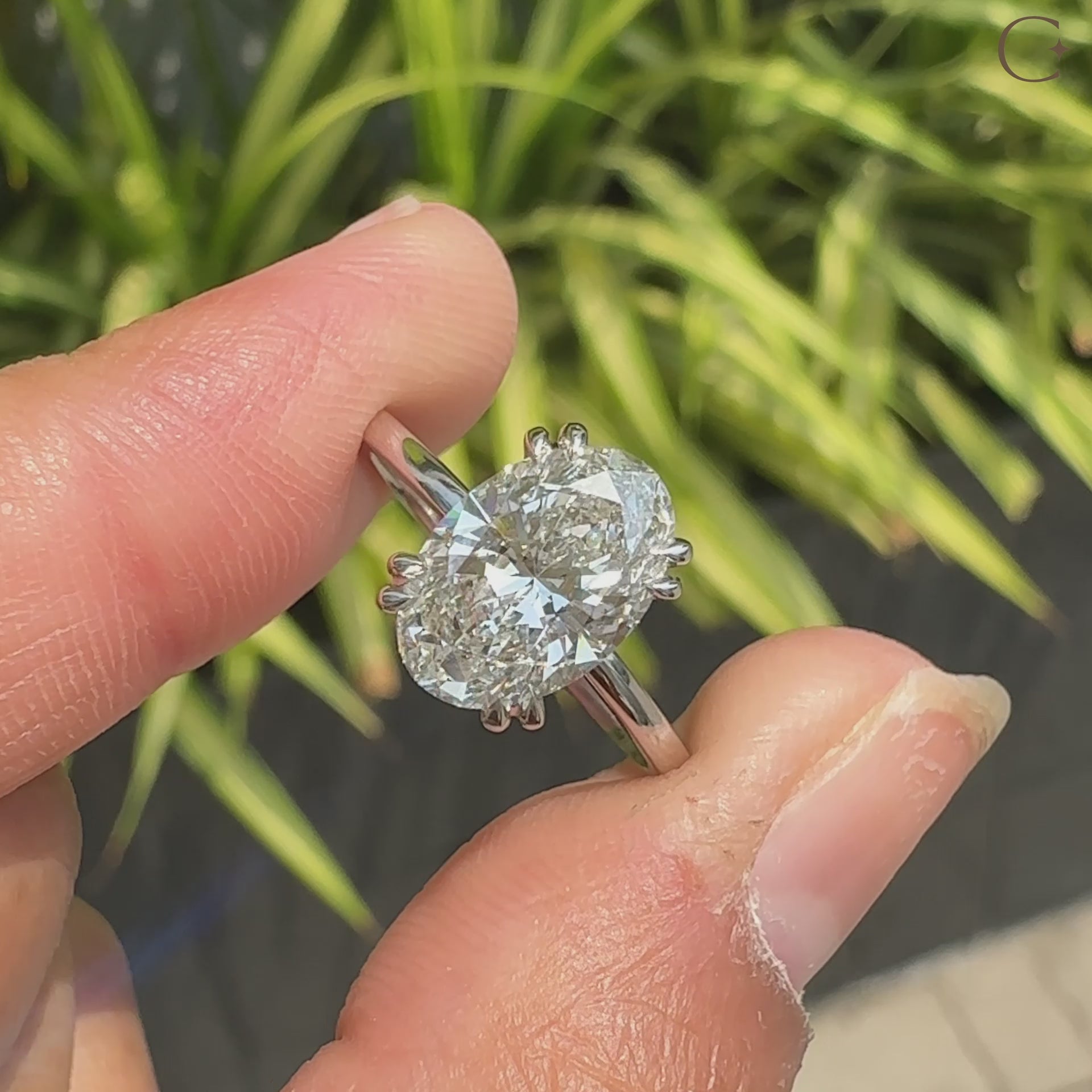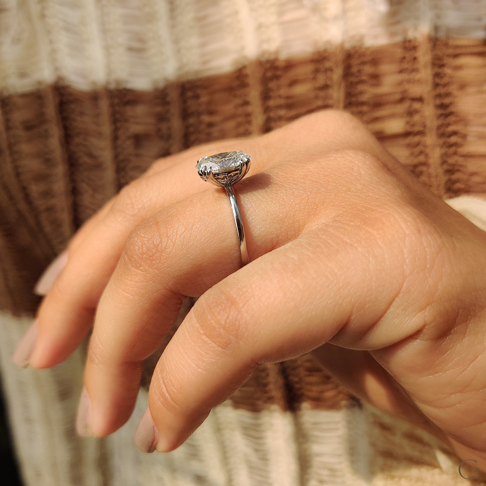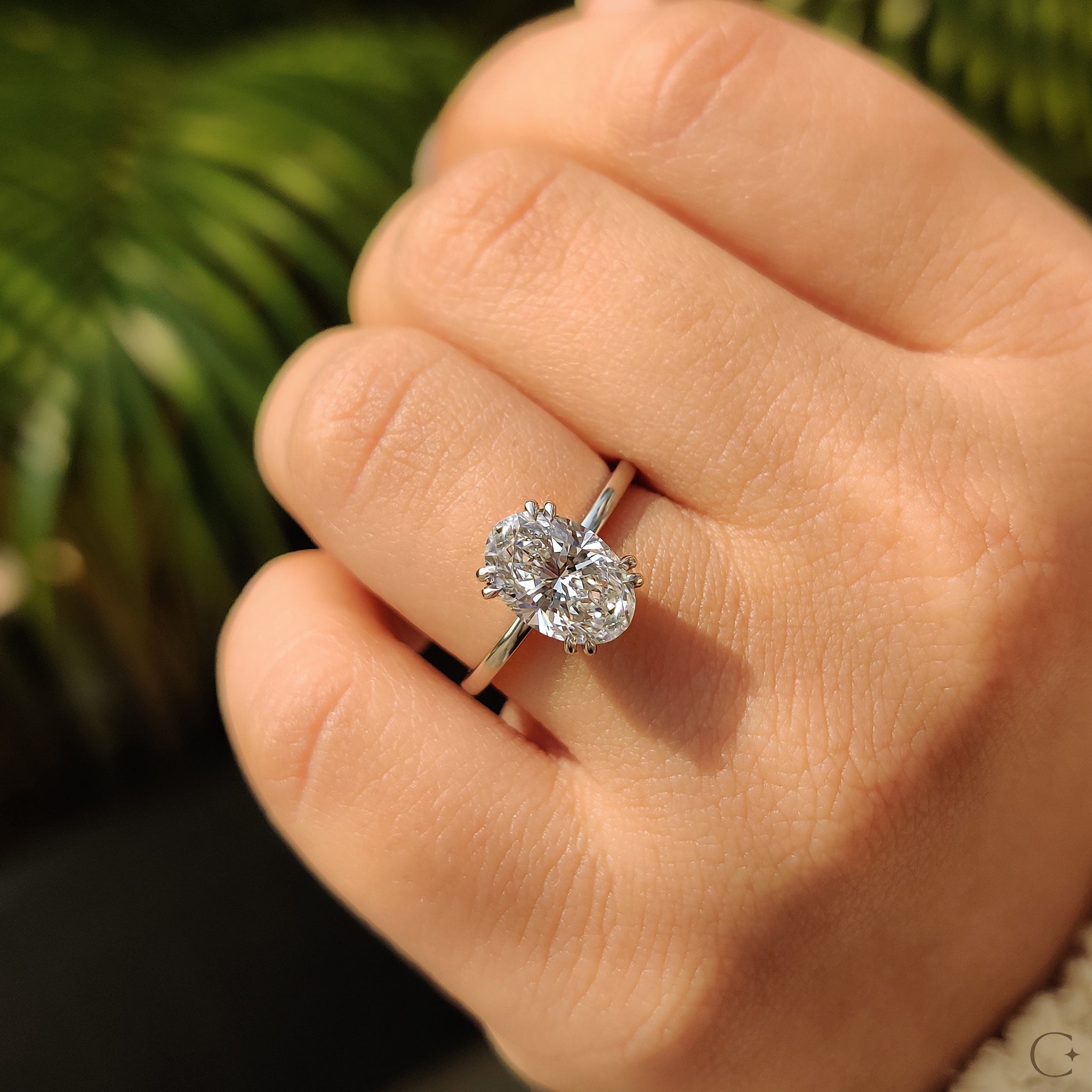 The amazing Oval Cut Diamond set in a classic Solitaire Setting is shown in this Oval Shaped Diamond Engagement Ring. Made in white gold, it has a Double Claw Prong Setting that exquisitely holds the center. Every handcrafted ring is IGI certified and created using a Lab Grown Diamond, thereby providing beauty with ethical considerations. Explore a classic design from the Carat Diamonds engagement ring range.