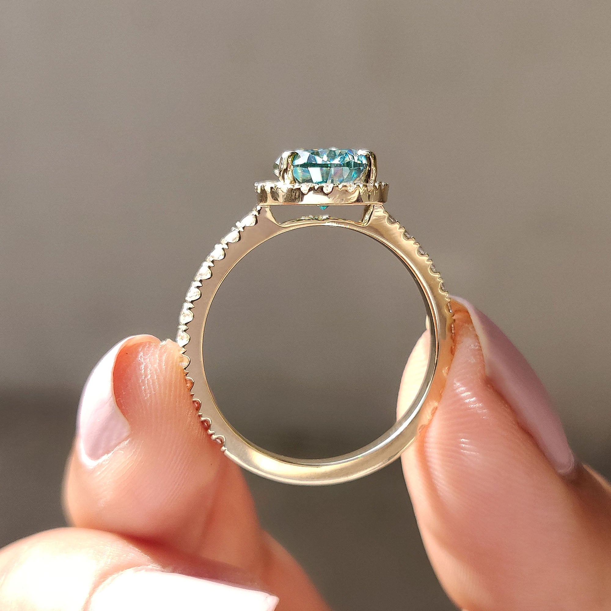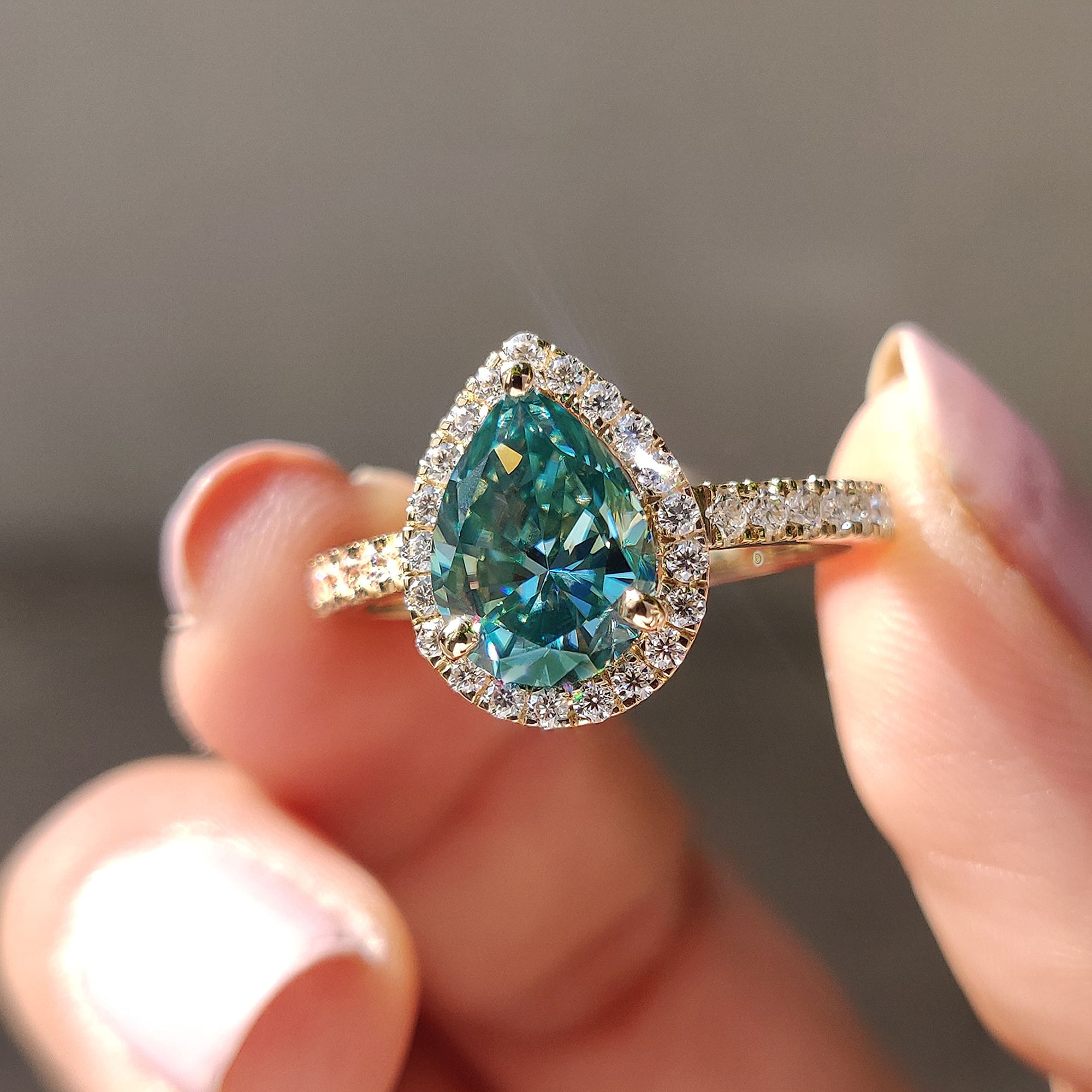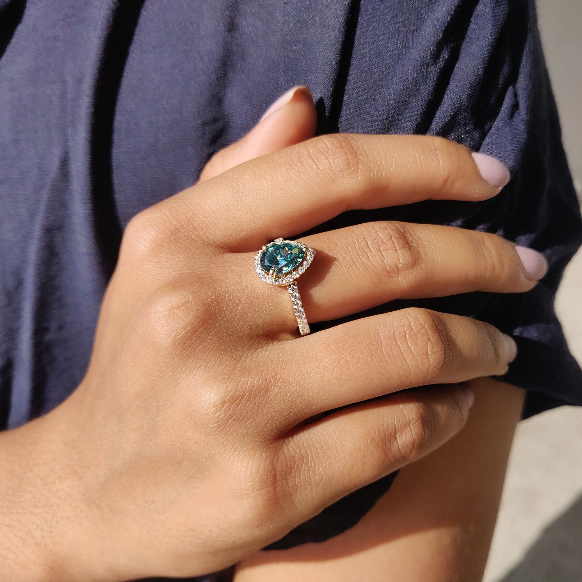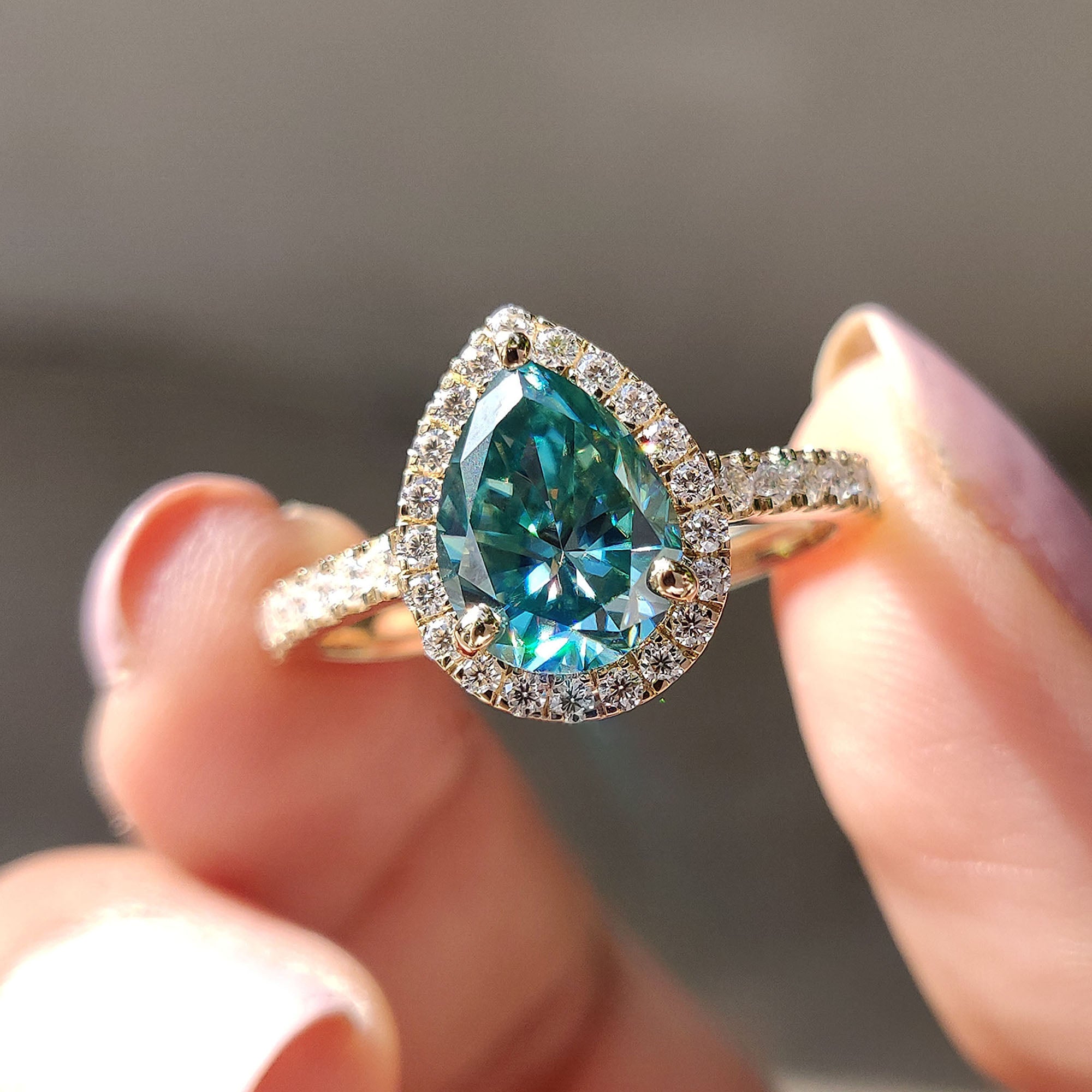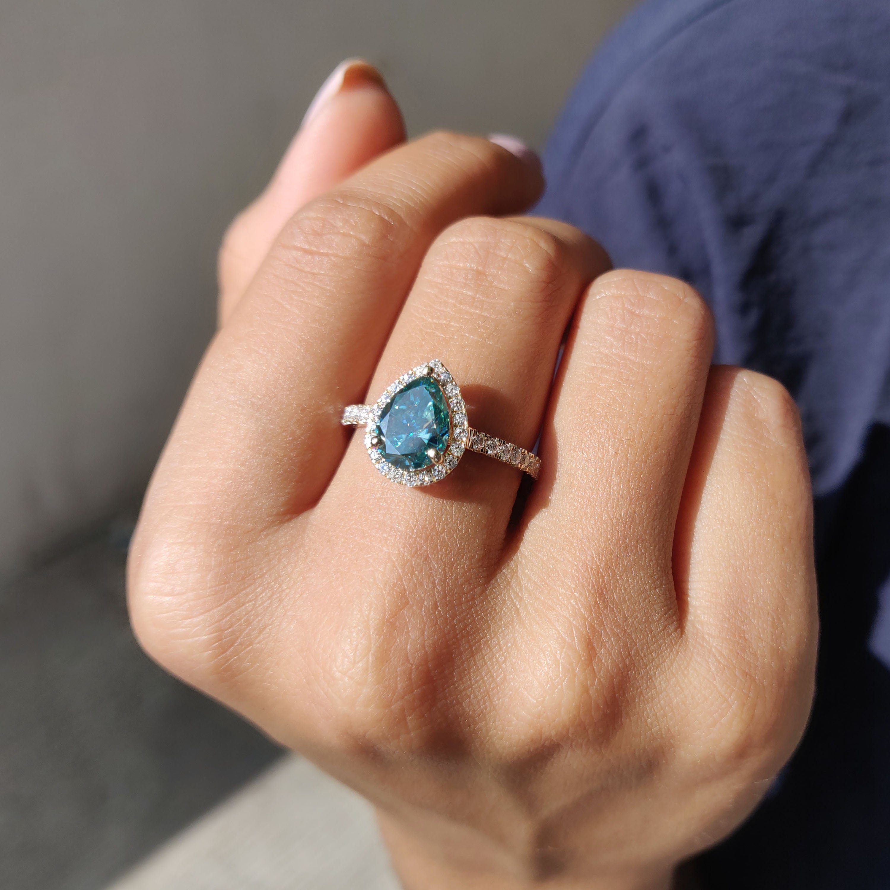 There are several designs for the pear cut ring, including a classic look with a round cut moissanite ring for those tastes. While a cyan blue Moissanite ring will give your proposal a distinctive touch, if you're searching for something quite unusual. Carefully crafted, this white gold ring is a lifelong, durable, and attractive choice.