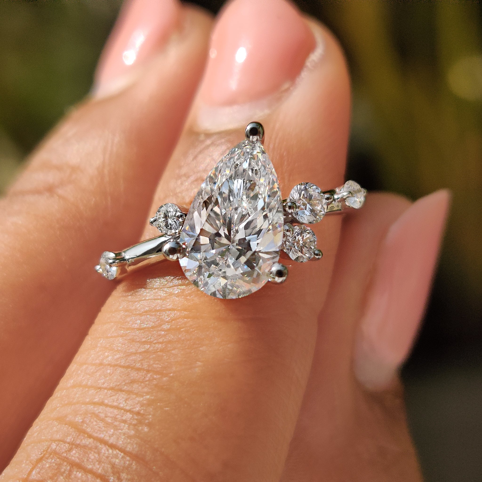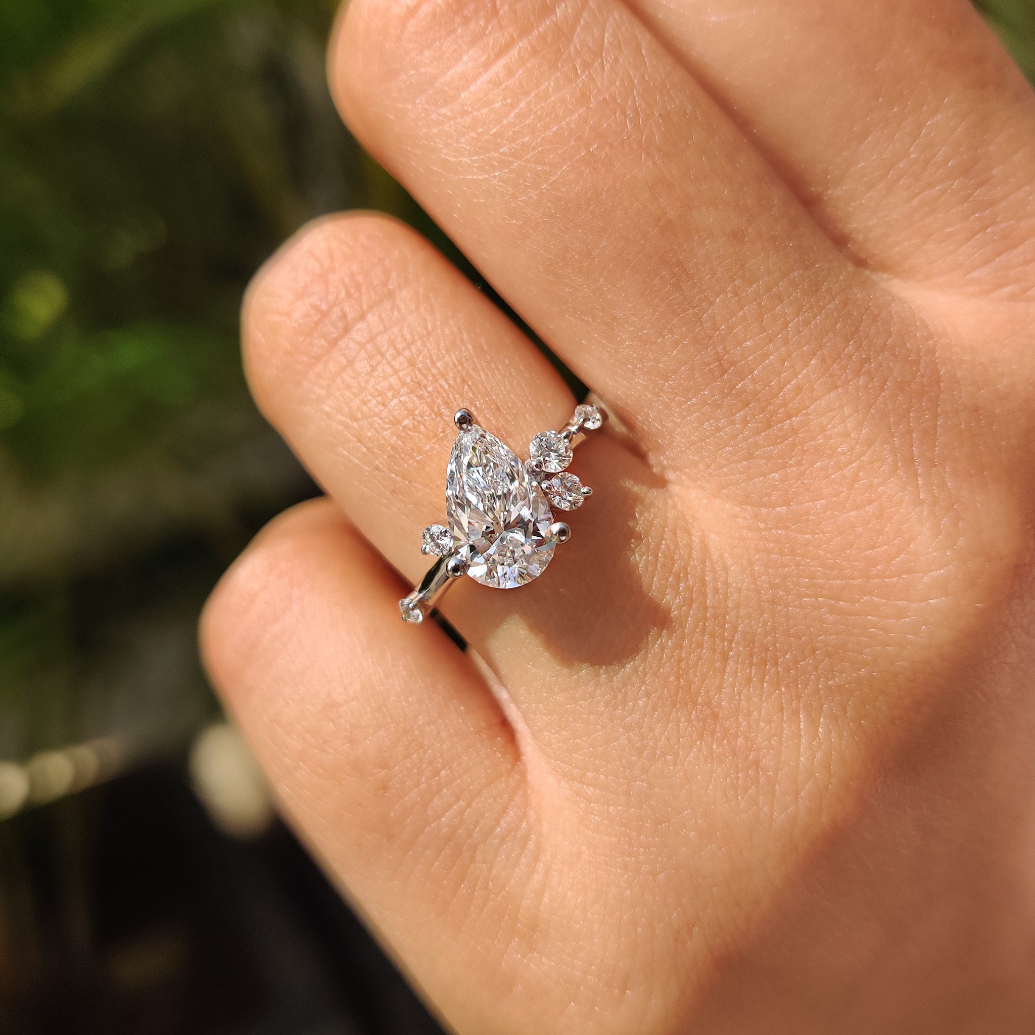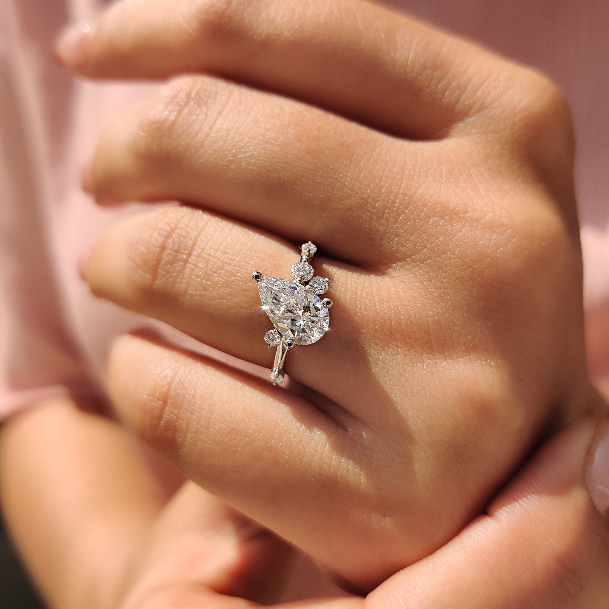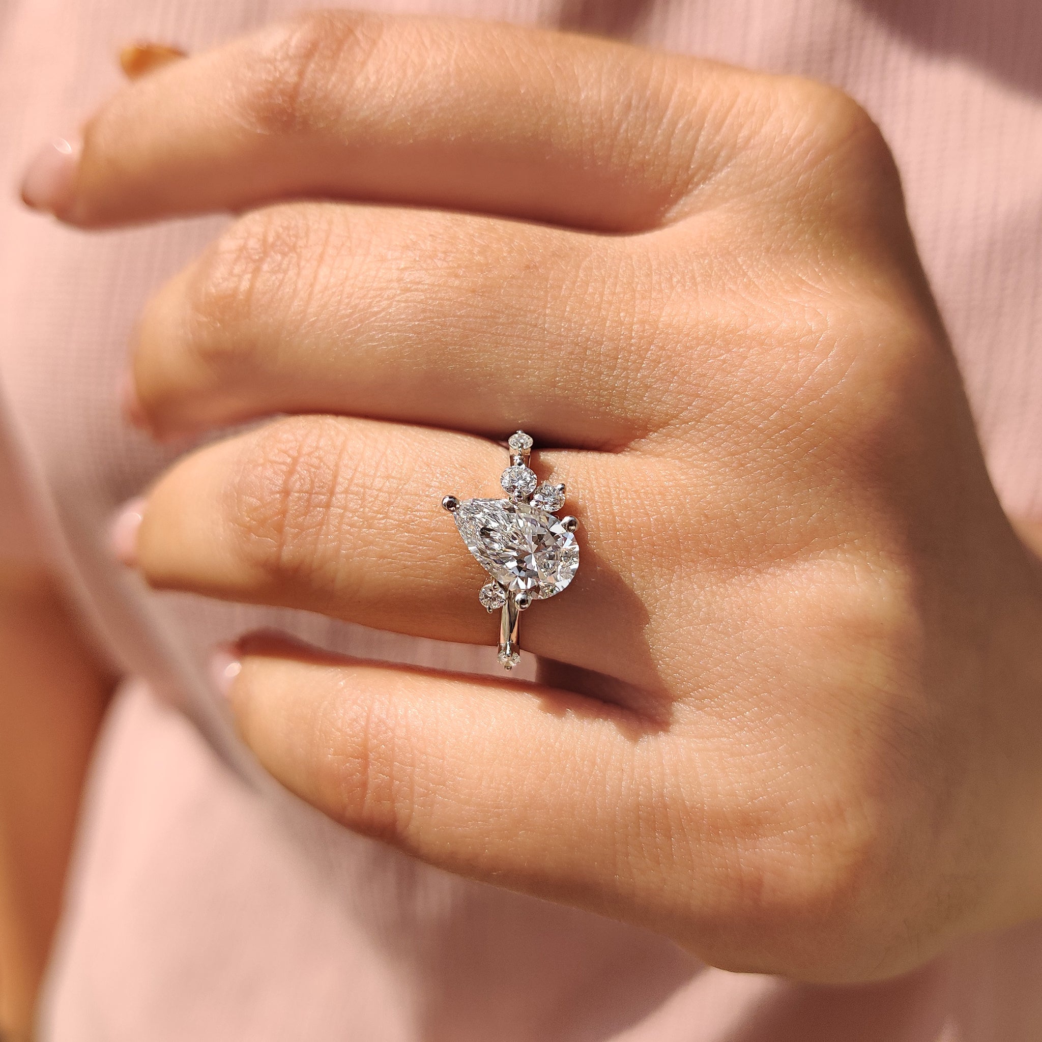 Select among the several stones available from Lab Grown Diamond or real diamonds. Choose the ideal location, perhaps a 3-prong arrangement or cluster engagement ring. Customize with a unique touch by customizing with engraving. The Pear Shape Diamond Ring is a beautiful, meaningful, and customizable symbol of love.
