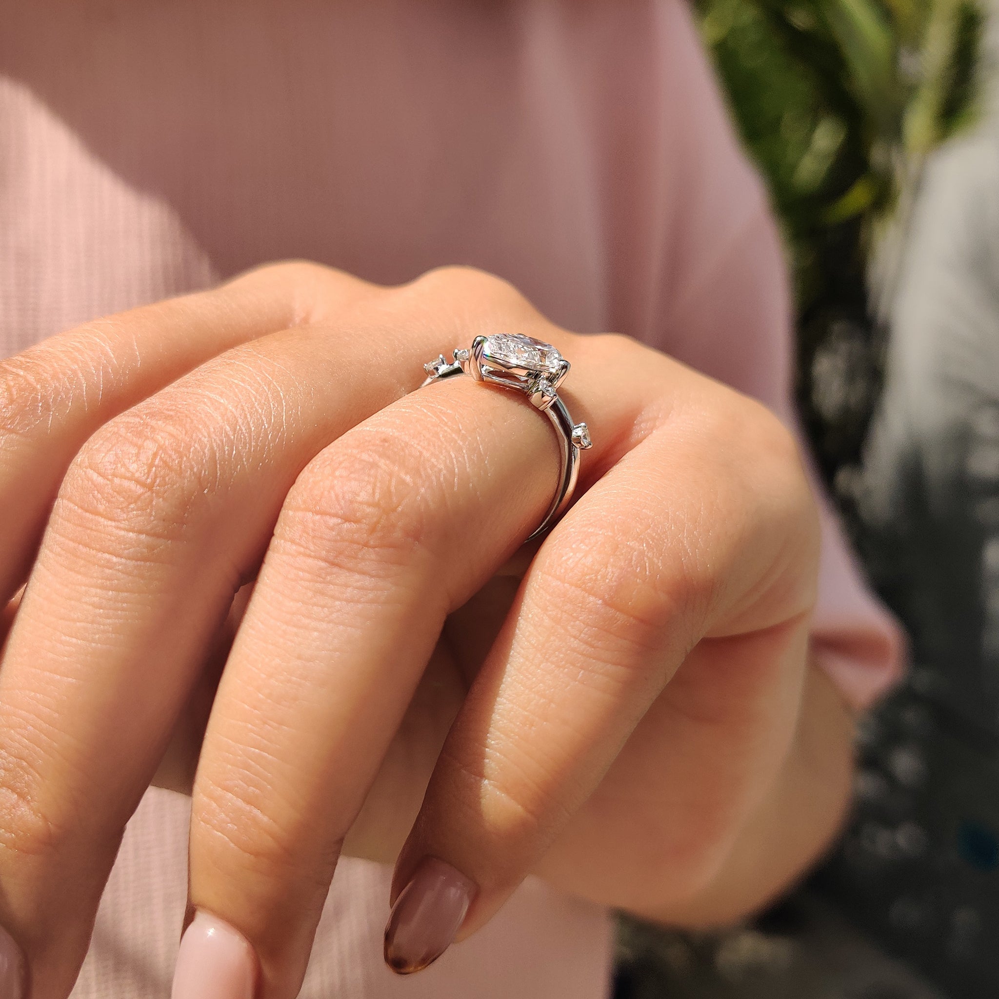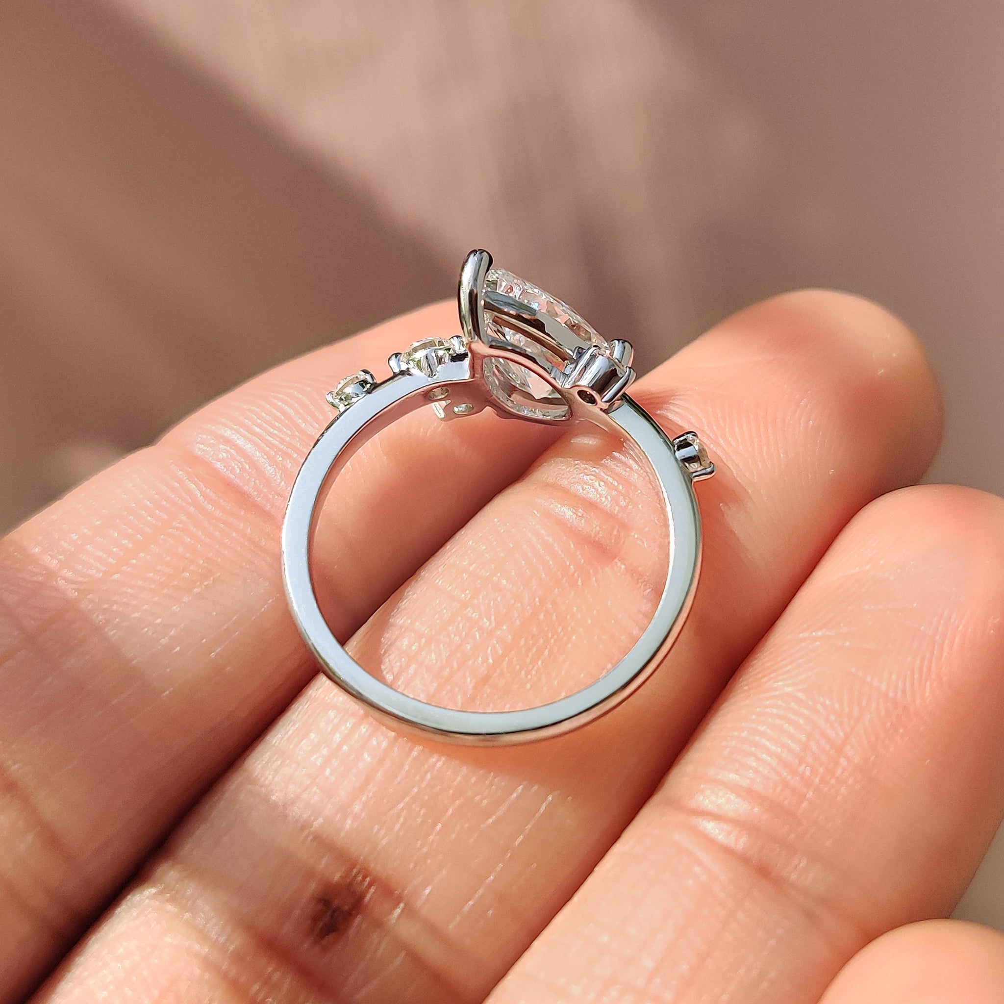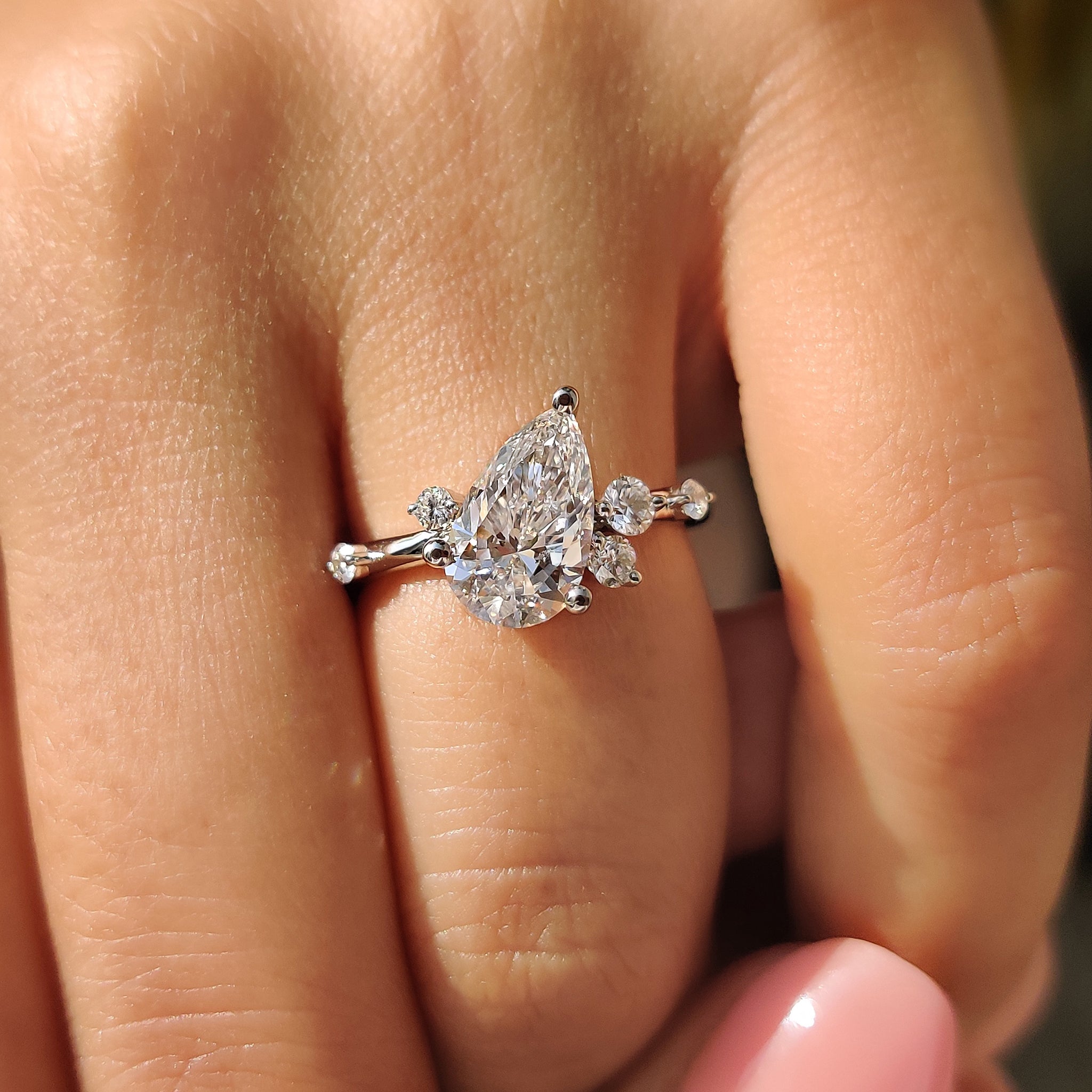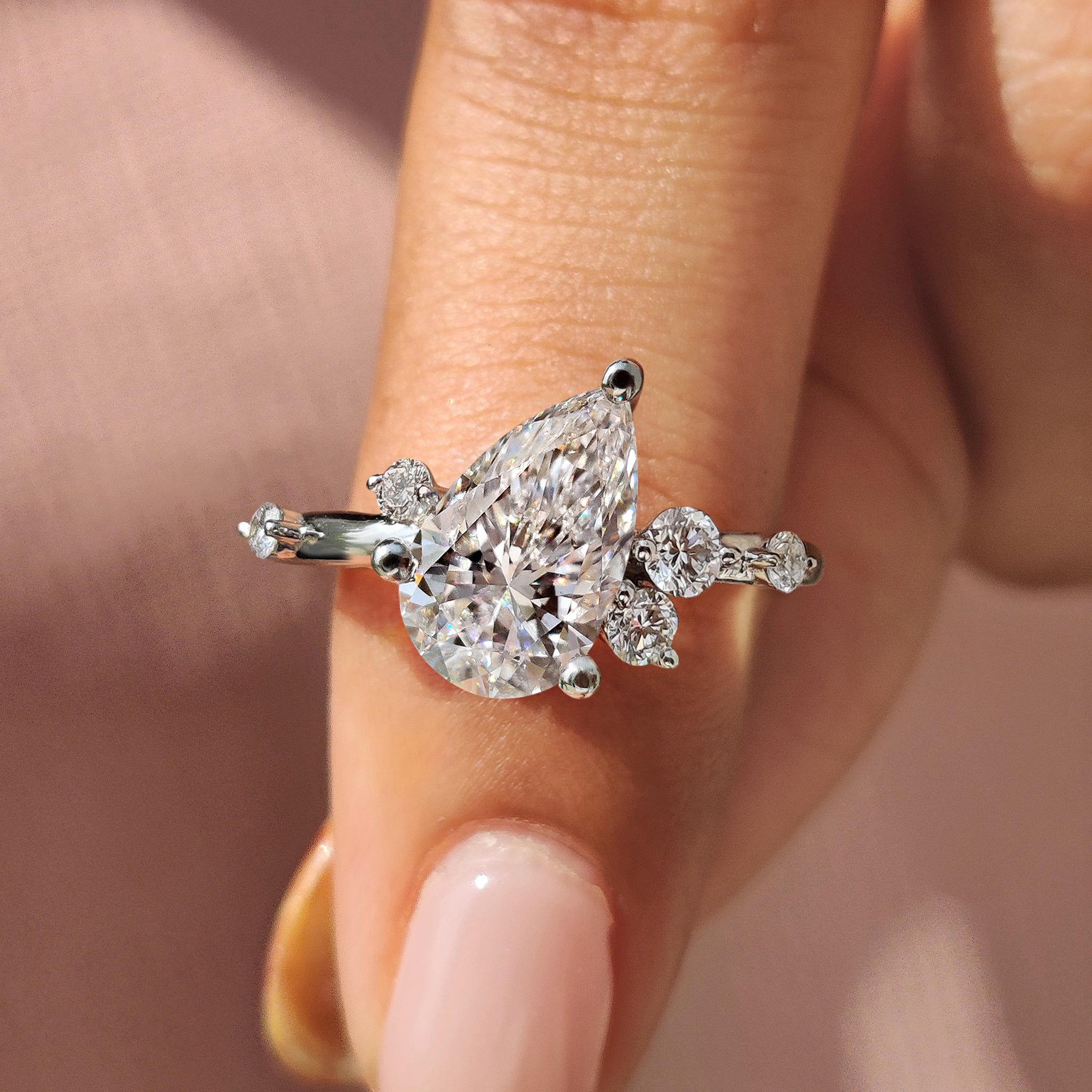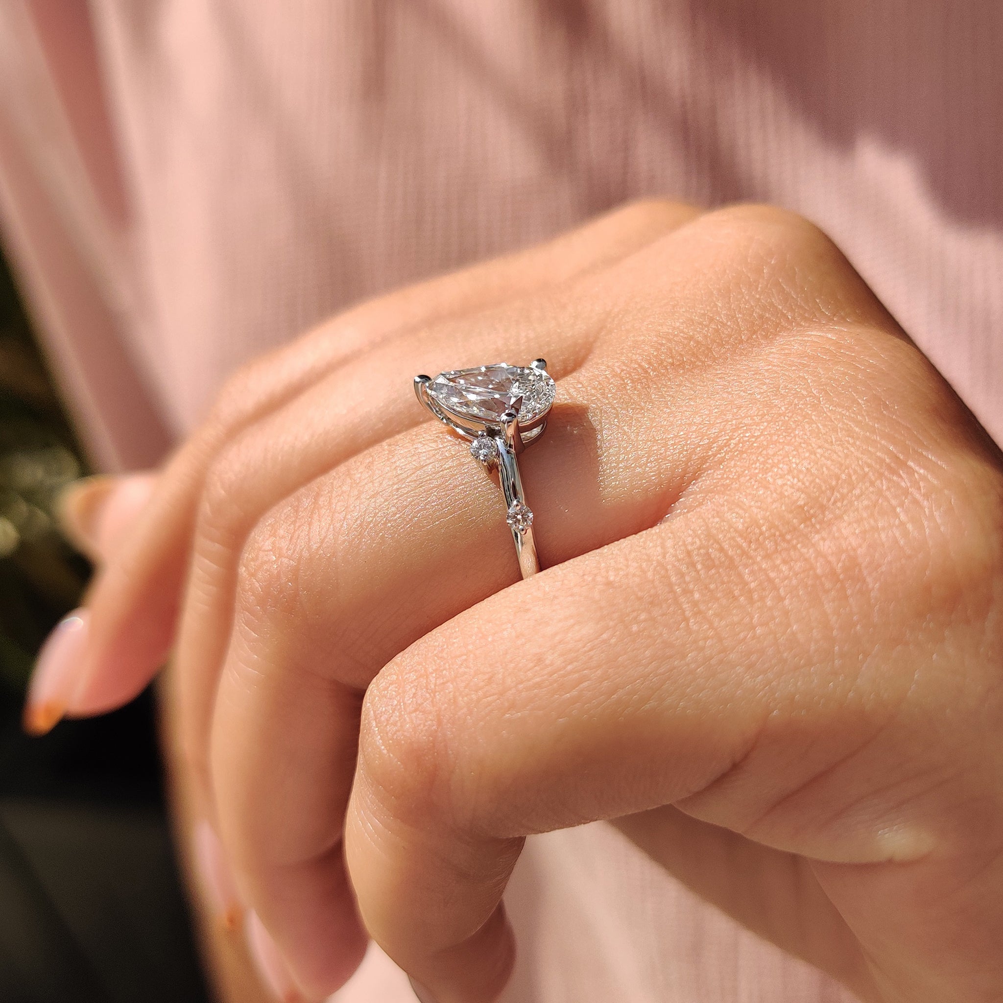 Select among the several stones available from Lab Grown Diamond or real diamonds. Choose the ideal location, perhaps a 3-prong arrangement or cluster engagement ring. Customize with a unique touch by customizing with engraving. The Pear Shape Diamond Ring is a beautiful, meaningful, and customizable symbol of love.
