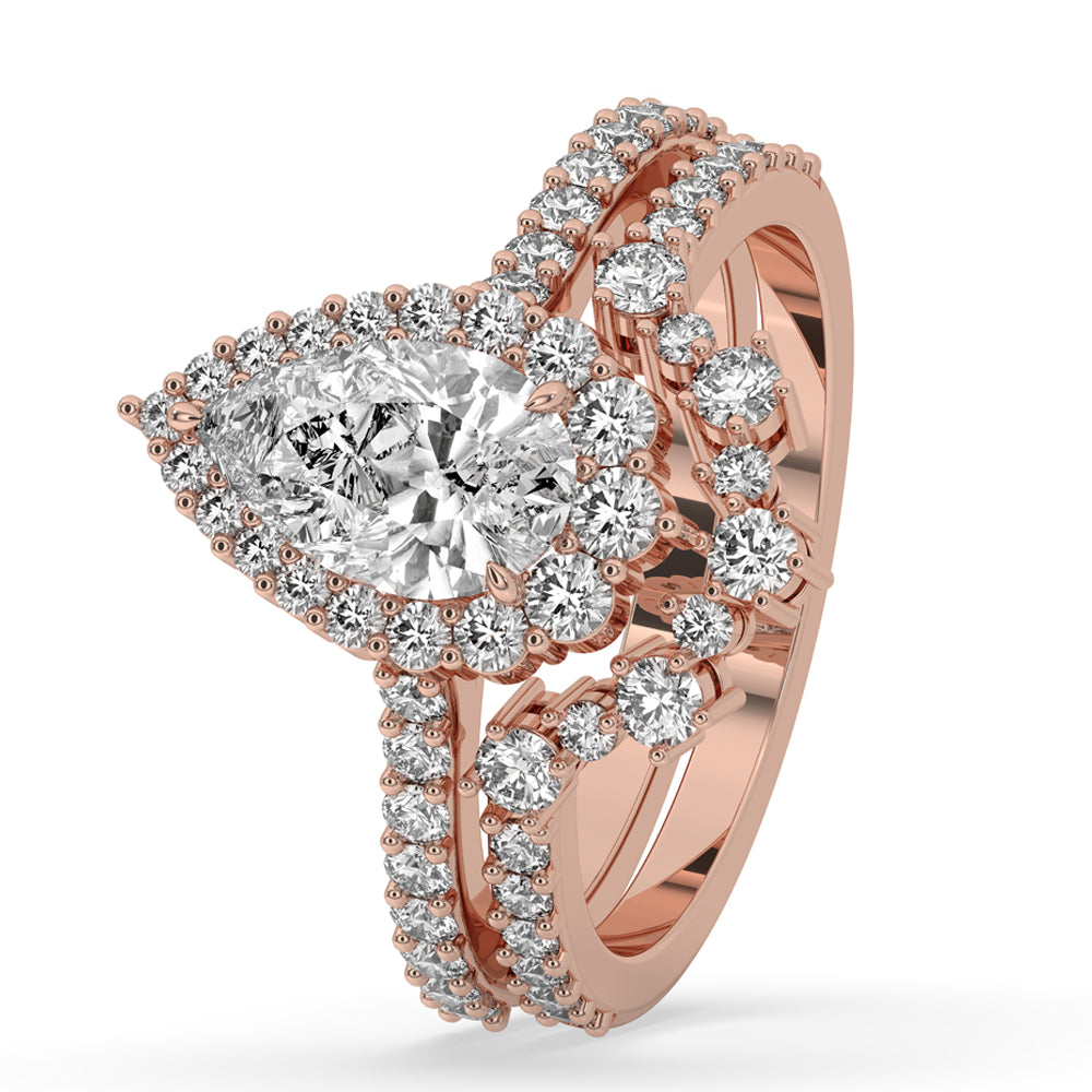 Searching for the best gift? Proposals, anniversaries, or other events call for this pear-shaped engagement ring with wedding band. It is a remarkable work because of its minute features and choice for a IGI certified diamond. For even more beauty, pair it with a bridal set or other bridal jewelry set.
