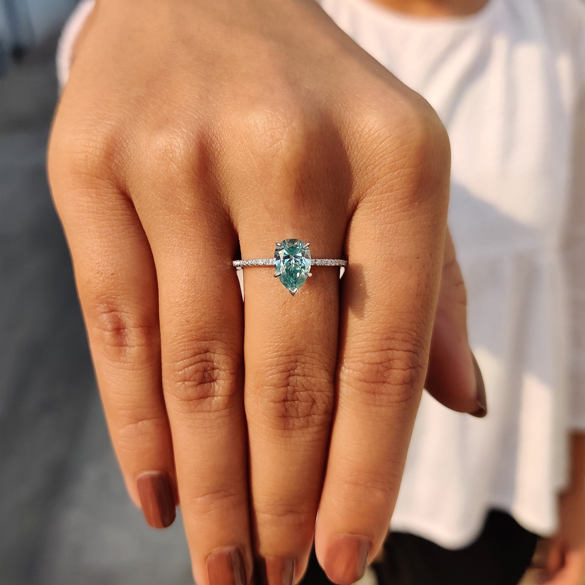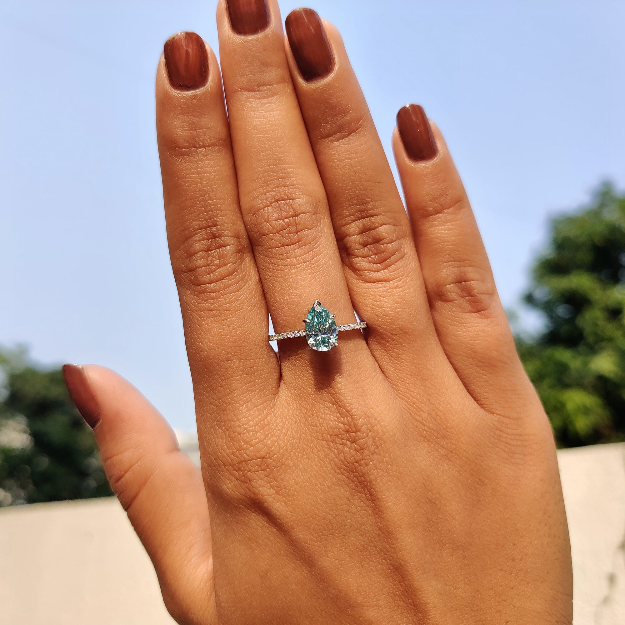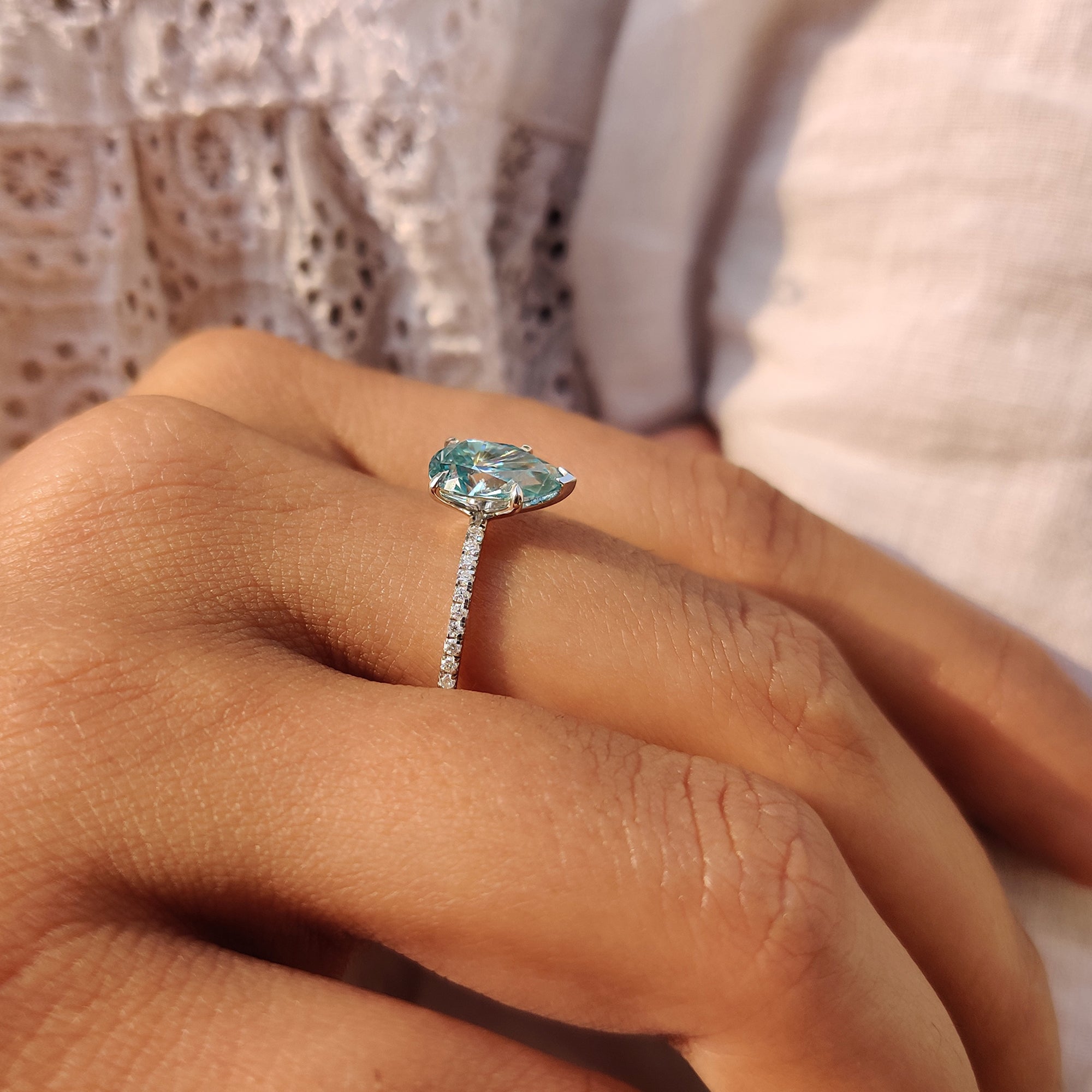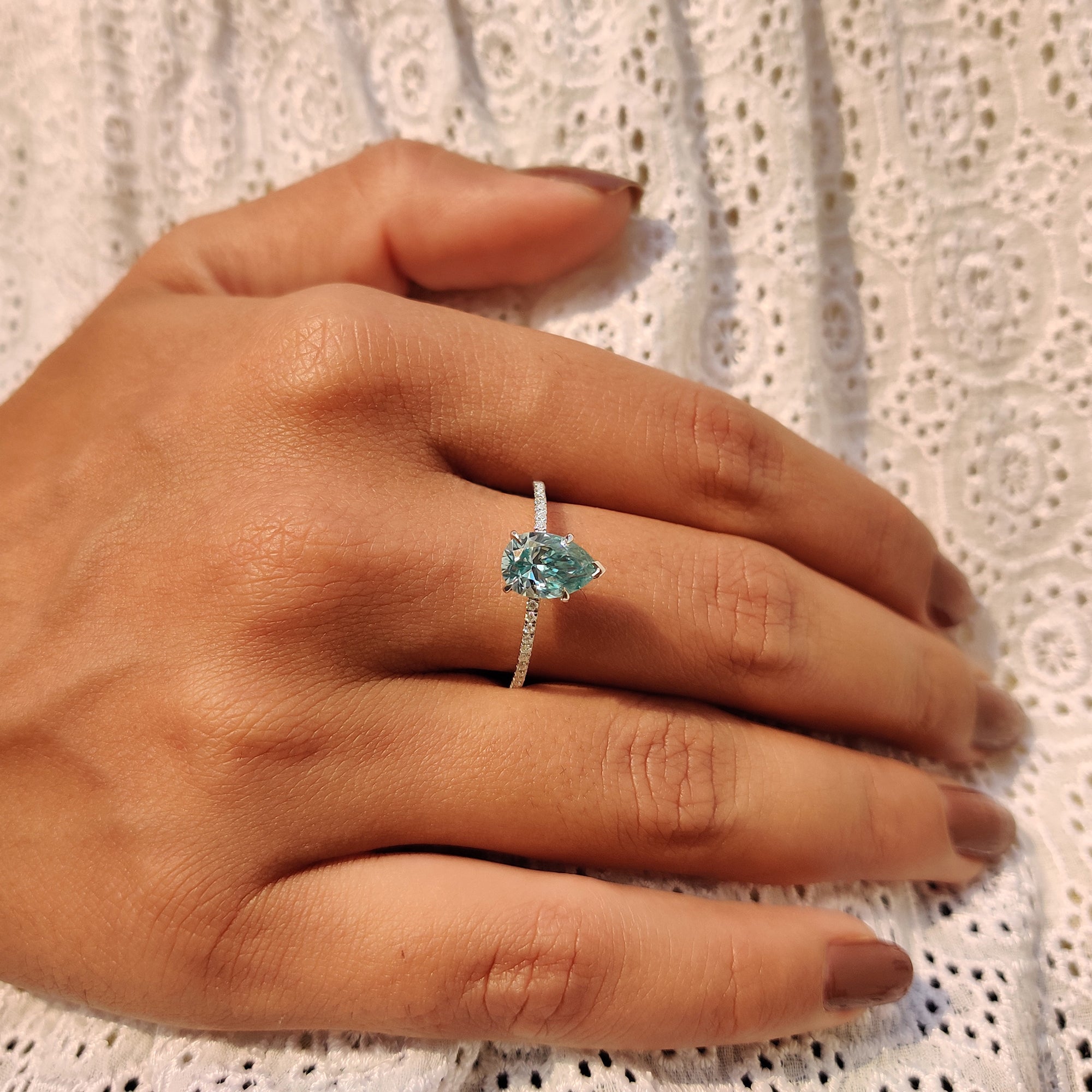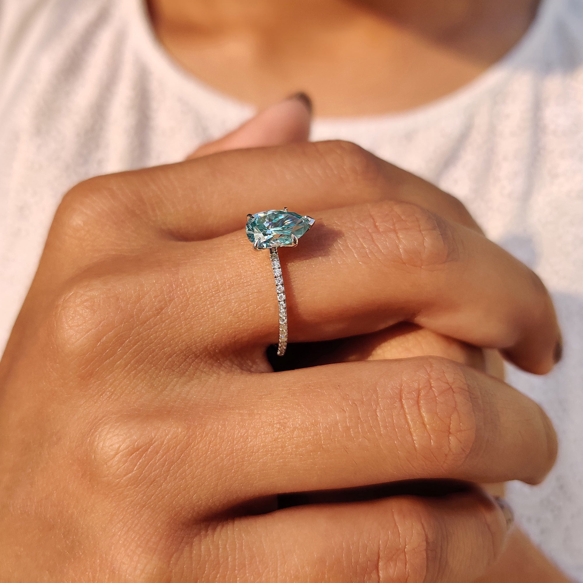 - Elegant pear shaped Moissanite ring for a unique, modern look