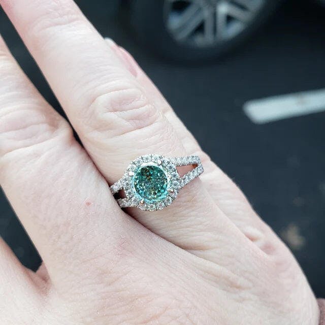 Portuguese Cut Engagement Ring with vibrant cyan blue moissanite