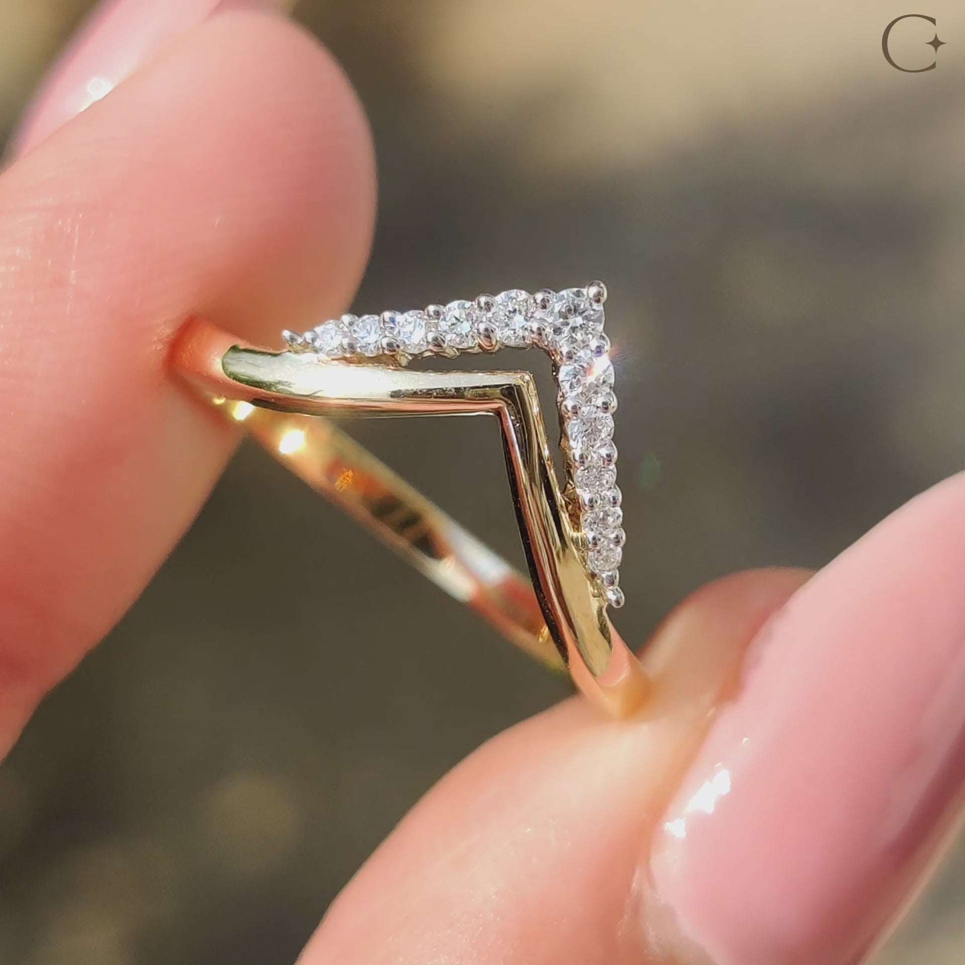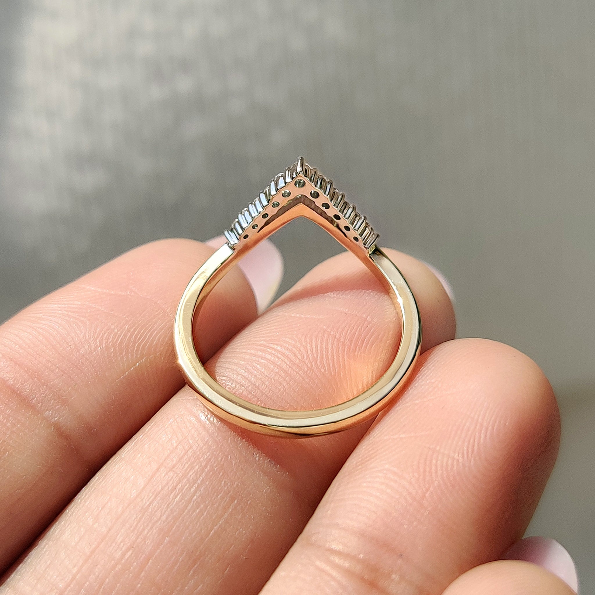 The stunning diamonds in our diamond chevron band give this already gorgeous design a hint of luxury. Every round Diamond wedding band creator expertly brings out the stones' inherent beauty and gives you a breathtaking shine that will last a lifetime. For people who like the classic beauty of round-cut stones, the Chevron Band option is ideal. This piece stands out in any collection due to its exceptional craftsmanship and design.