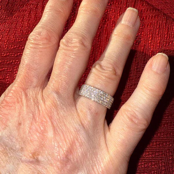 Round Cut Wedding Band offers a structured and polished design made for everyday wear. It features a multi row pave set band layout with precisely placed stones that shine evenly.Built with strength and balance, this white gold wedding band uses a smooth, durable base that feels light on the finger.