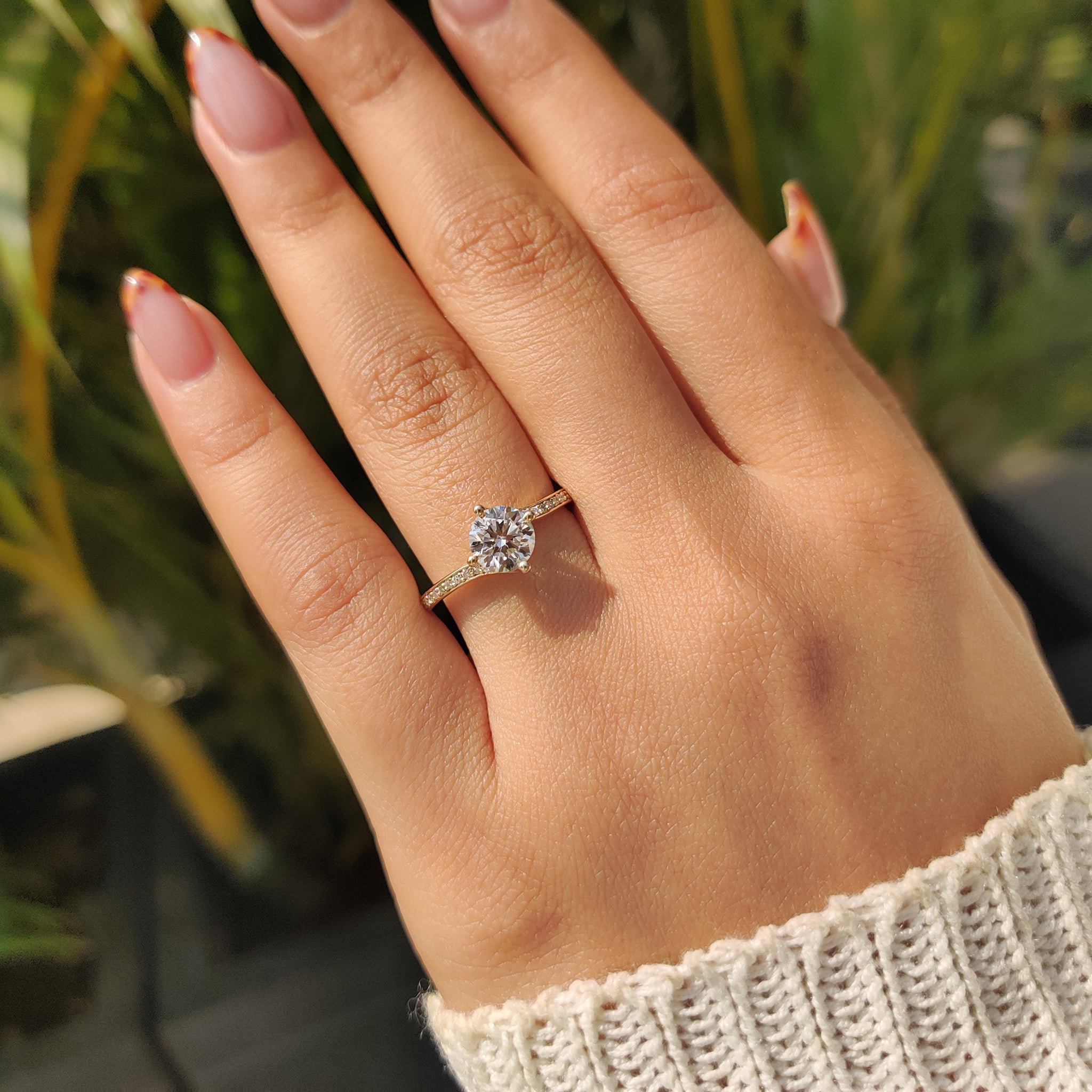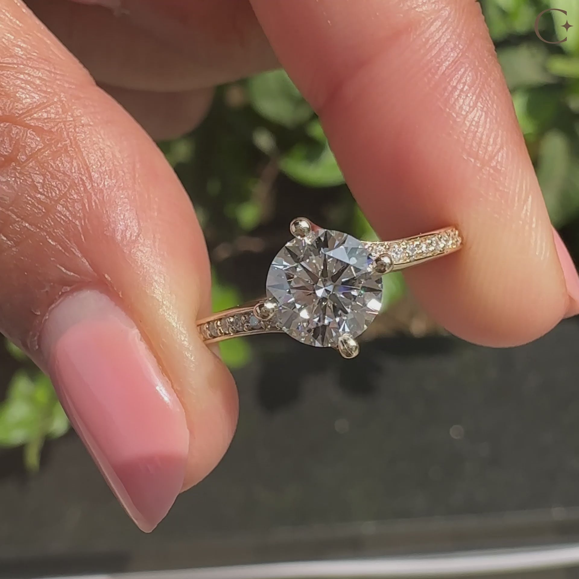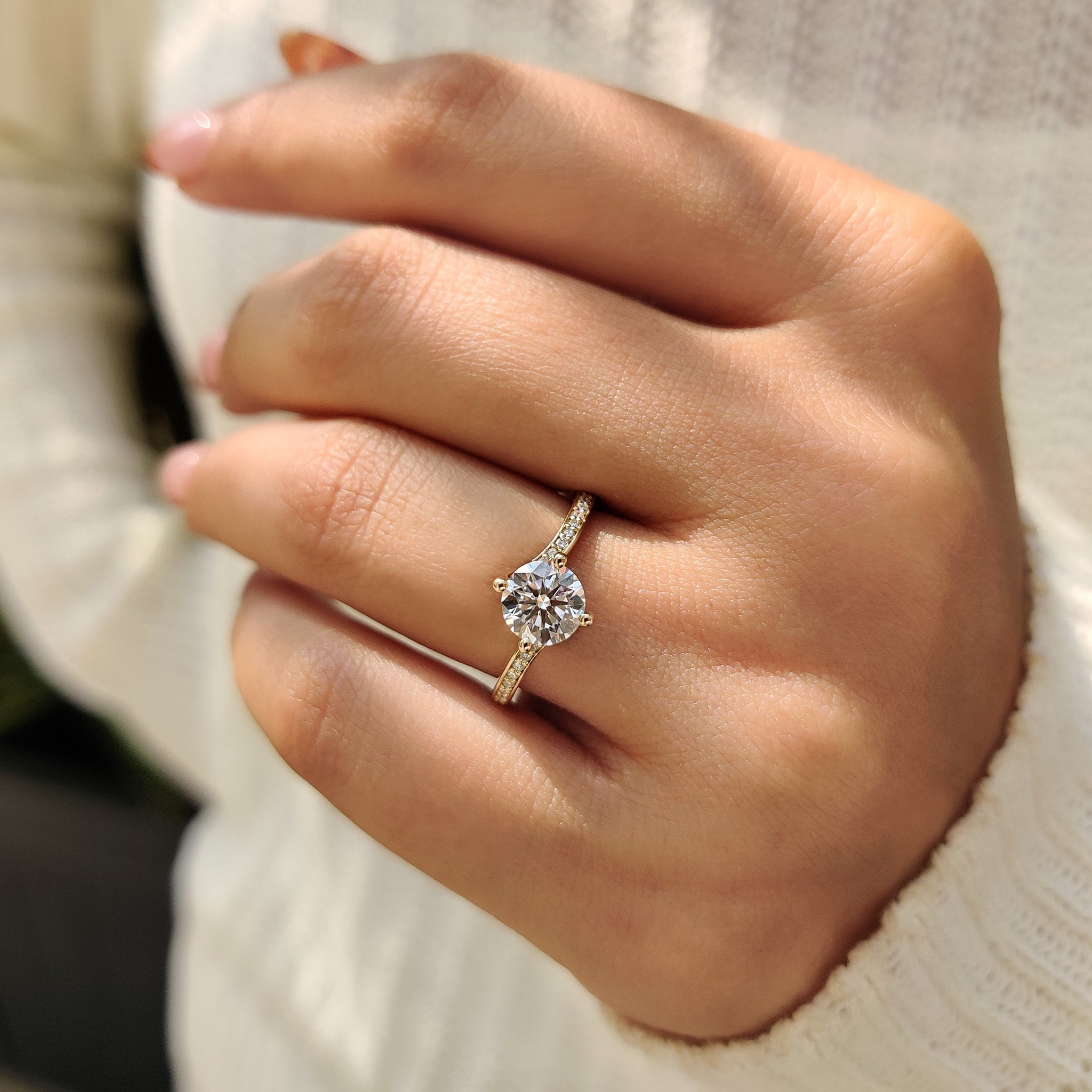 Excellent stone visibility, thanks to the compass prong engagement ring design, guarantees your selected diamond glows brilliantly. The Bypass Ring Setting will highlight your stone wonderfully, whether you go on a round diamond ring setting or a diamond ring pave setting. There is a range of metals available for the setting, including yellow gold engagement ring choices, therefore providing an extra degree of luxury.